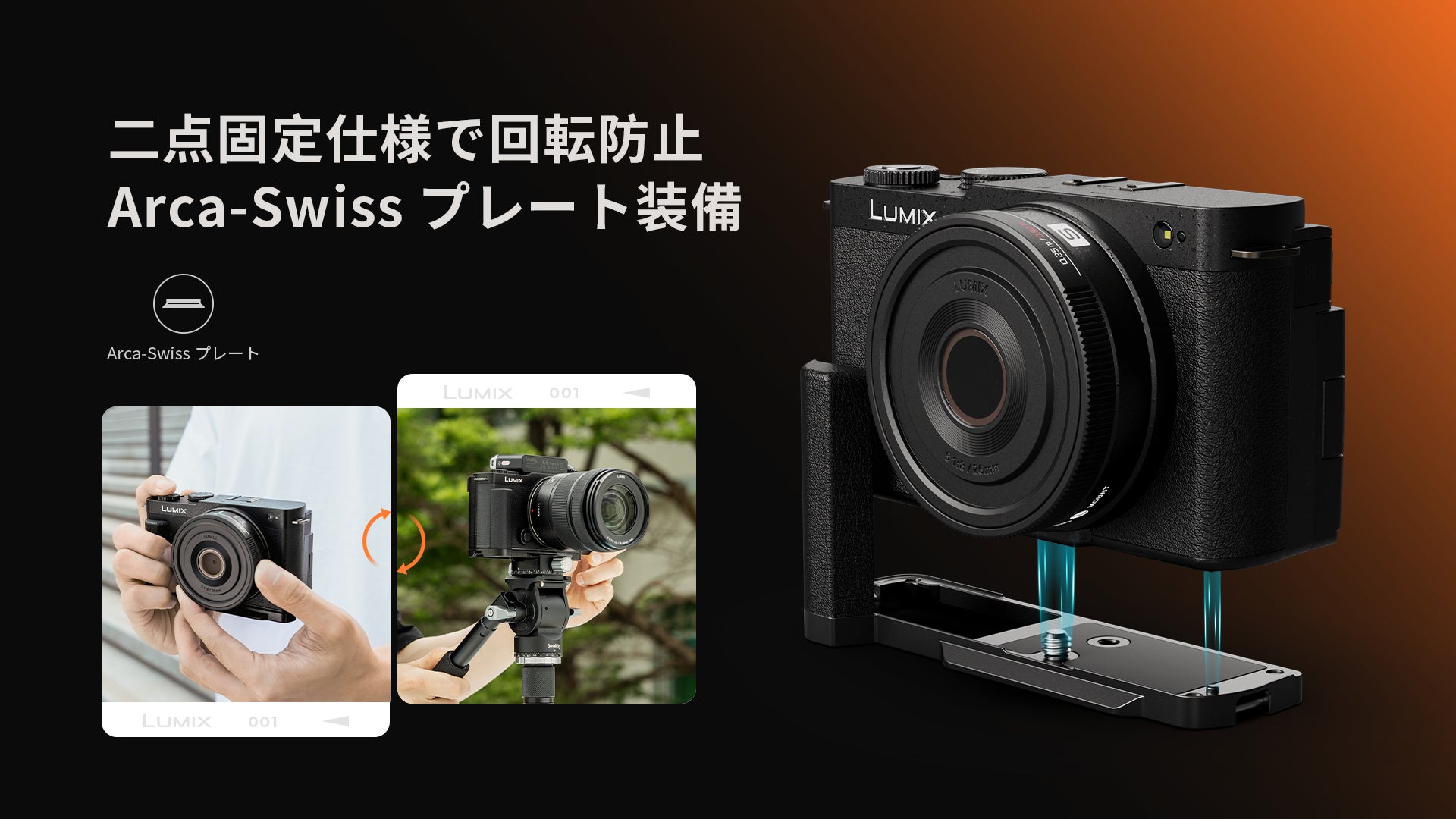 二点固定仕様により回転を防止します。底面のArca-Swiss互換のクイックリリースプレートにより、三脚の取り付けることが容易に行えます。