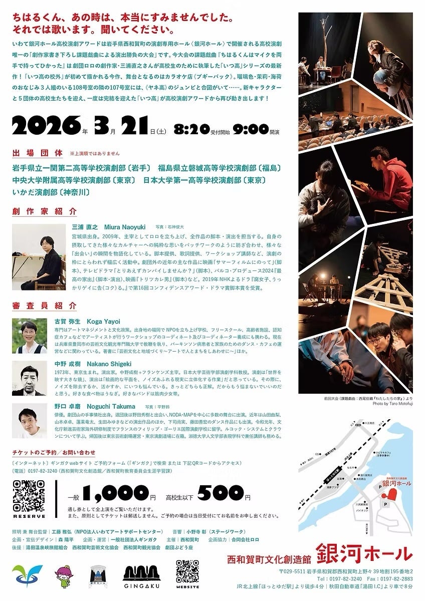 岩手県西和賀町(町長 内記和彦)と、一般社団法人ギンガク(岩手県西和賀町上野々/代表 森陽平)は、2026年3月21日(土)、西和賀町文化創造館「銀河ホール」にて全国唯一の “演出勝負” による高校演劇大会 「いわて銀河ホール高校演劇アワード2026」 を開催します。