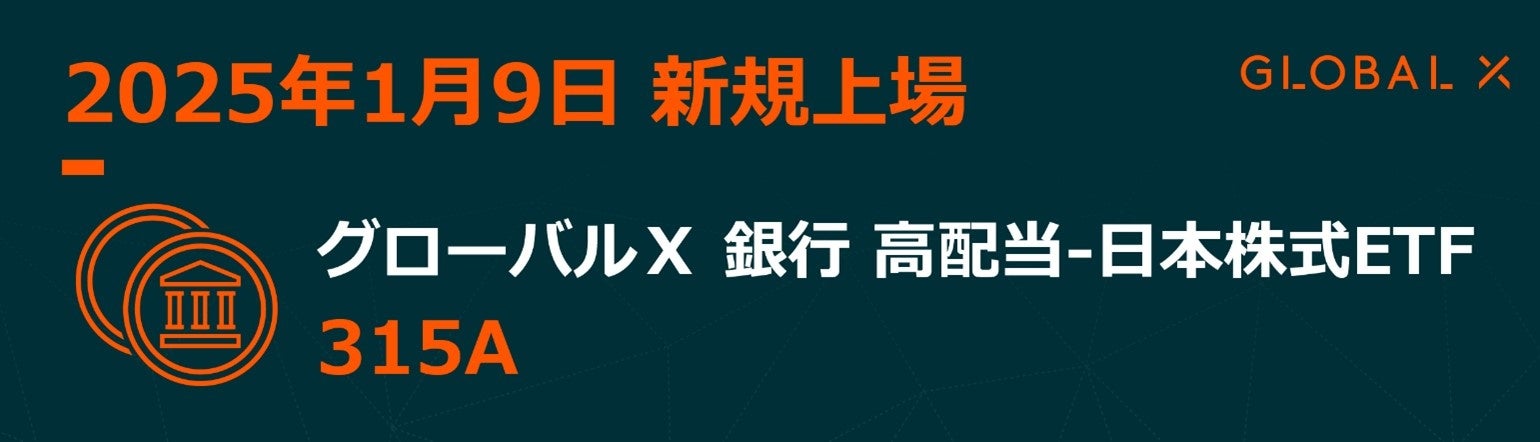 大和証券グループのETF専門資産運用会社であるGlobal X Japan株式会社(本社:東京都千代田区、社長:姜 昇浩。以下「当社」)は2025年1月9日に、東京証券取引所へ「グローバルX 銀行 高配当-日本株式ETF」【315A】を新規に上場したことをお知らせします。