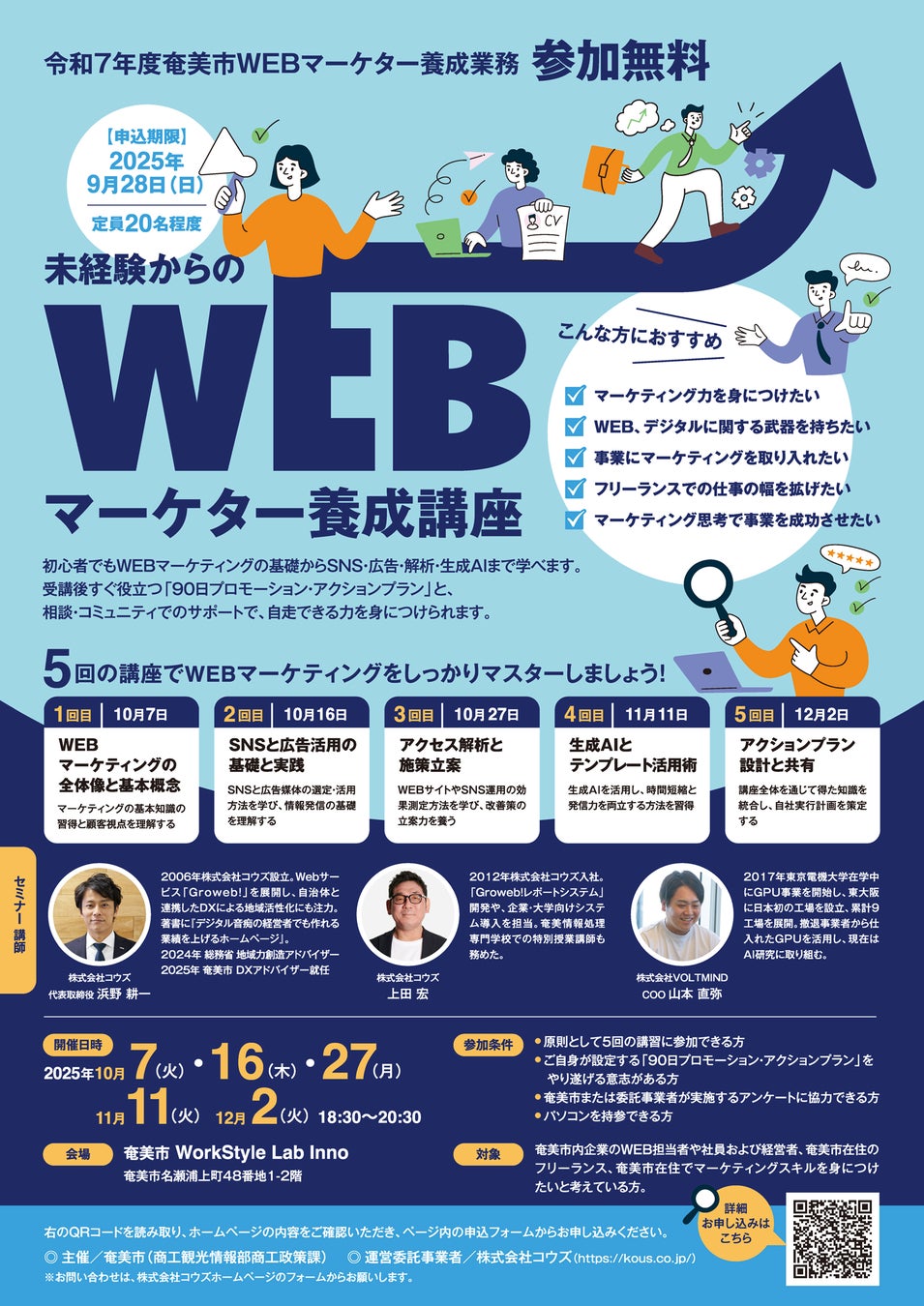 株式会社VOLTMIND(本社:大阪府大阪市、代表取締役:北森 聖士、以下「当社」)は、2025年11月11日、鹿児島県奄美市が主催し、株式会社コウズ(本社:大阪府大阪市、代表取締役:浜野 耕一、以下「コウズ」)が運営を行う、令和7年度 奄美市WEBマーケター養成業務『未経験からのWEBマーケター養成講座』に外部講師として登壇いたしました。