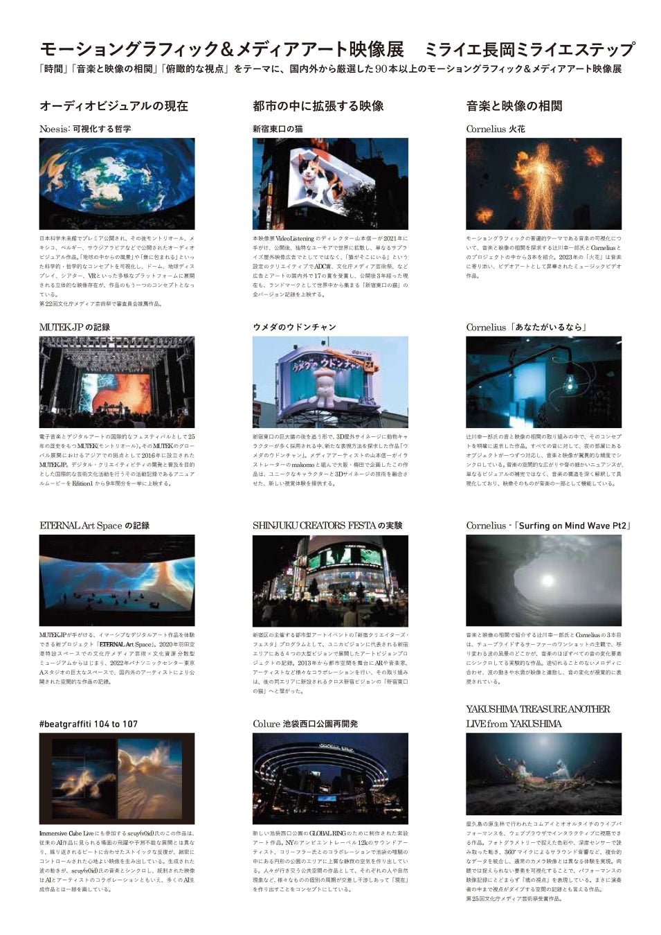 国内外のミュージックビデオやオーディオビジュアルライブ、文化庁メディア芸術祭で紹介された アート作品など、ポップなものからアート性の高い作品までを幅広く上映します。