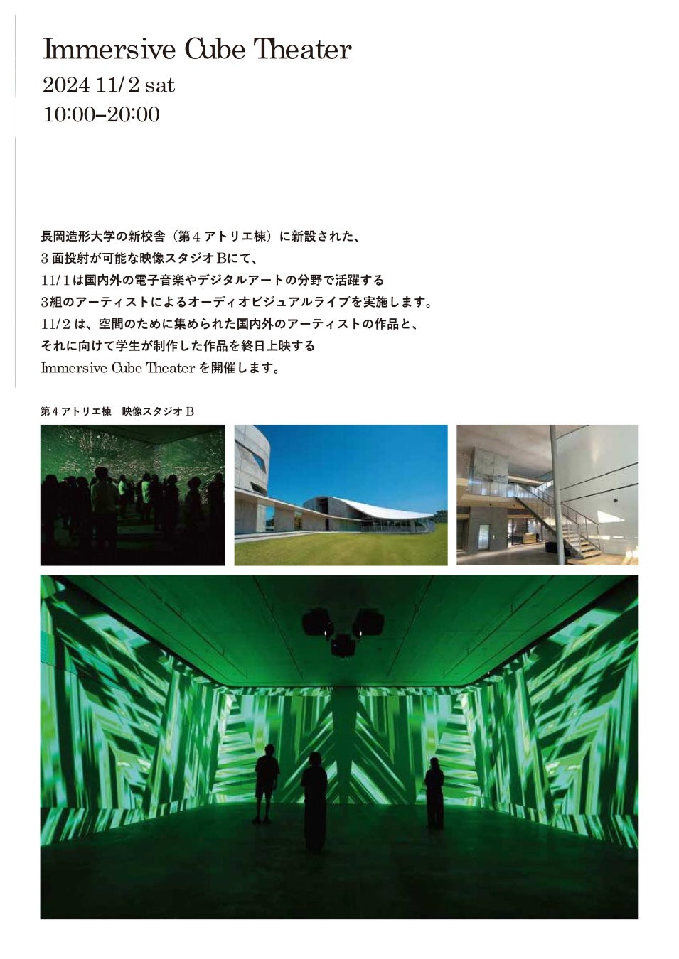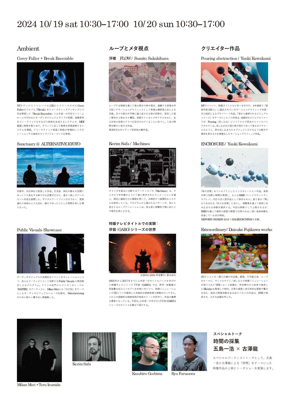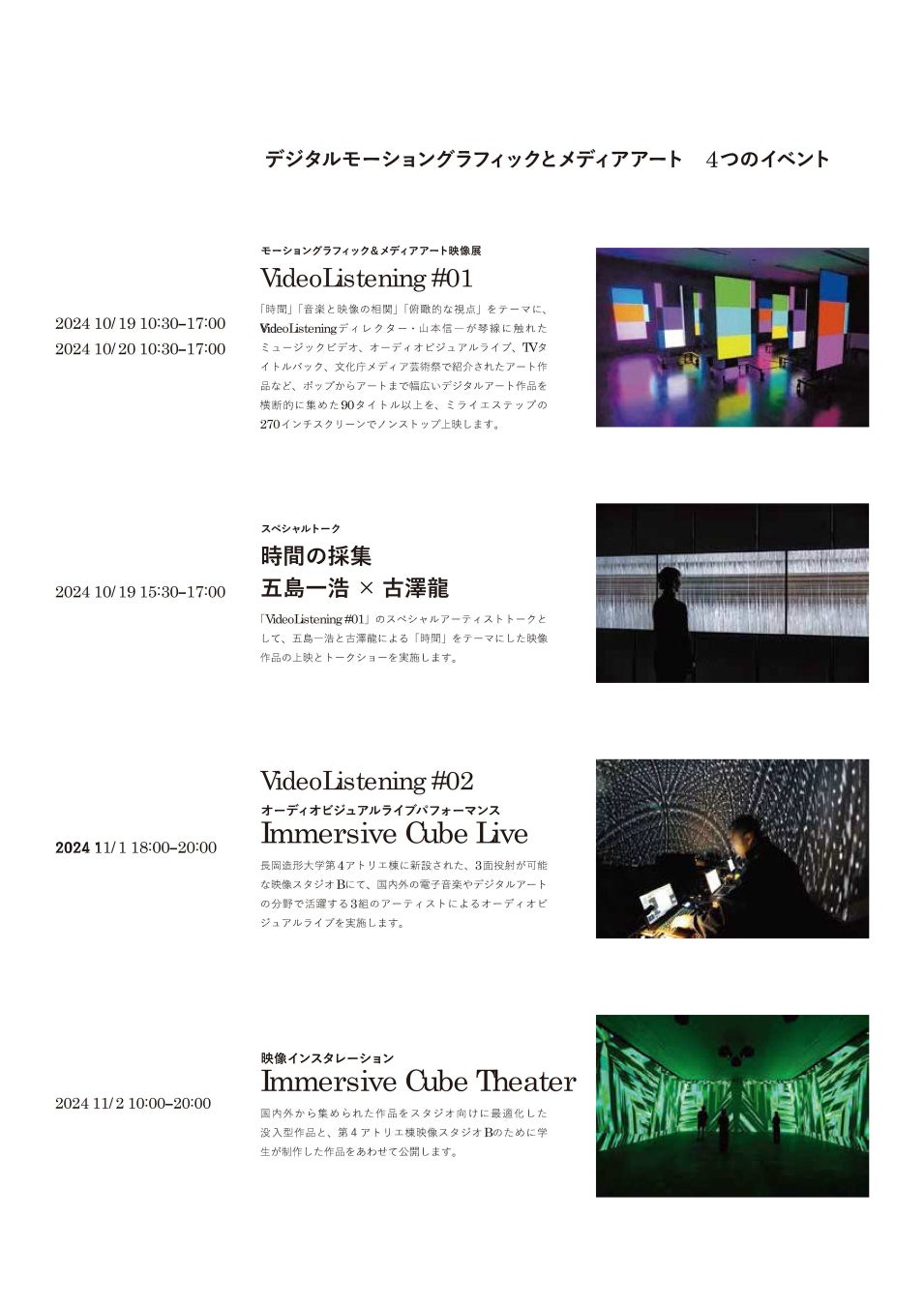 デジタルモーショングラフィックの黎明期から活動を続けるメディアアーティスト・山本信一氏(長岡造形大学デザイン学科教授)のセレクションで、国内外で活躍する16人以上のクリエイターによるデジタルアート作品約90タイトルの映像展を開催します。また、五島一浩氏と古澤龍氏による「時間」をテーマにした映像作品の上映とトークイベントを開催します。