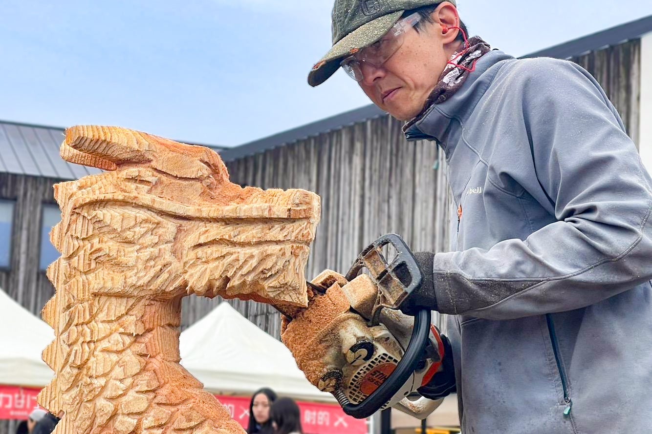 毎年恒例の新春チェンソーアートショー。林業家であり、kiondではチェンソーアート体験の講師も務める梶谷哲也氏によるパフォーマンスです。1m超の三重県産の杉を複数台のチェンソーで彫刻していきます。チェンソーの豪快な音とは対照的に、刃先を使って細かい部分まで丁寧に彫刻することもあり、思わず息を止めて見入ってしまいます。完成した作品は、kiondの正面入口にて1年間展示されます。