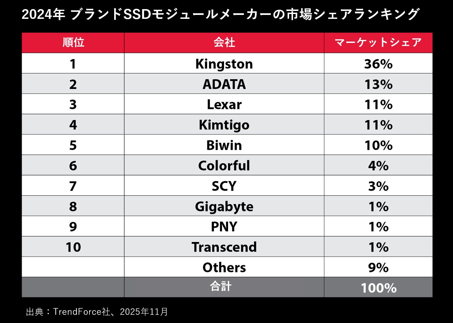台北– 11月20日、2025 – メモリストレージ製品および技術ソリューションの世界的リーダーであるKingston Technologyは本日、TrendForceが2024年のチャネル市場でのSSDのサードパーティサプライヤーとしてKingstonを第1位に選出したことを発表しました。TrendForceのデータによると、Kingstonは2024年に世界全体のSSD出荷台数のうち36%を占め、過去最高のシェアを記録し、メモリとSSDの世界シェアにおいて首位の座を維持しています。