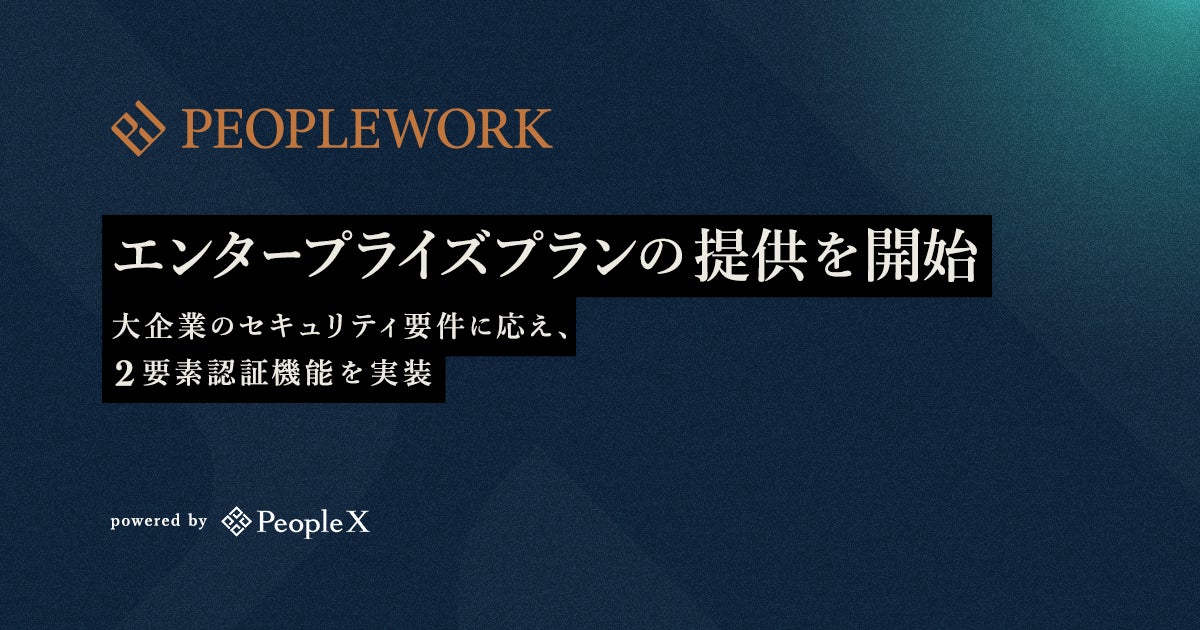 エンプロイーサクセス事業を推進する株式会社PeopleX(本社:東京都渋谷区、 代表取締役 兼 CEO:橘 大地、以下:当社)は、エンプロイーサクセスHRプラットフォーム「PeopleWork」のエンタープライズプランの提供を開始し、2要素認証機能を実装、より高度なセキュリティ要件に対応したことをお知らせいたします。