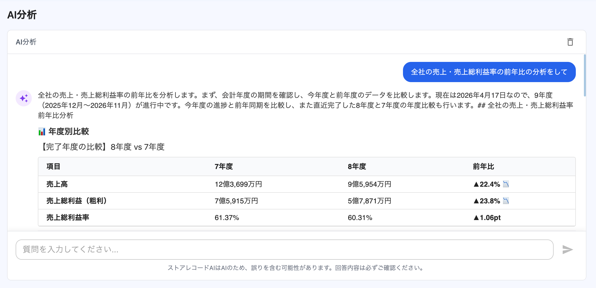 こうした課題を解消すべく、当社は生成AIを活用した分析機能「ストアレコード AI」を開発いたしました。経営者や現場担当者が、社内のデータアナリストに問いかけるような感覚で、自然な日本語で質問するだけで、自社の経営データに基づいた回答と可視化を得ることが可能です。