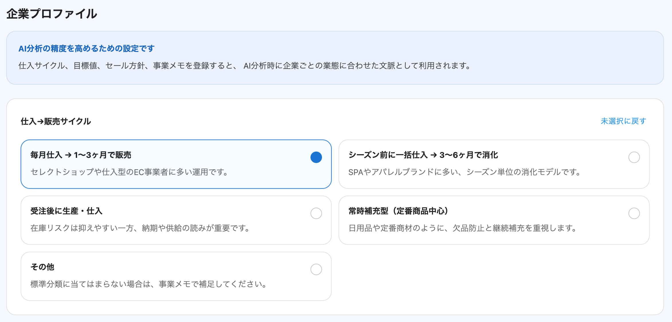 自社で設定した目標在庫日数や値下げ開始の目安をAIが参照し、一般論ではなく自社基準に沿った評価・提案が得られます。在庫管理会議や商品会議の事前準備を削減しながら、個別SKUに対する具体的なアクションまで素早く引き出すことが可能です。