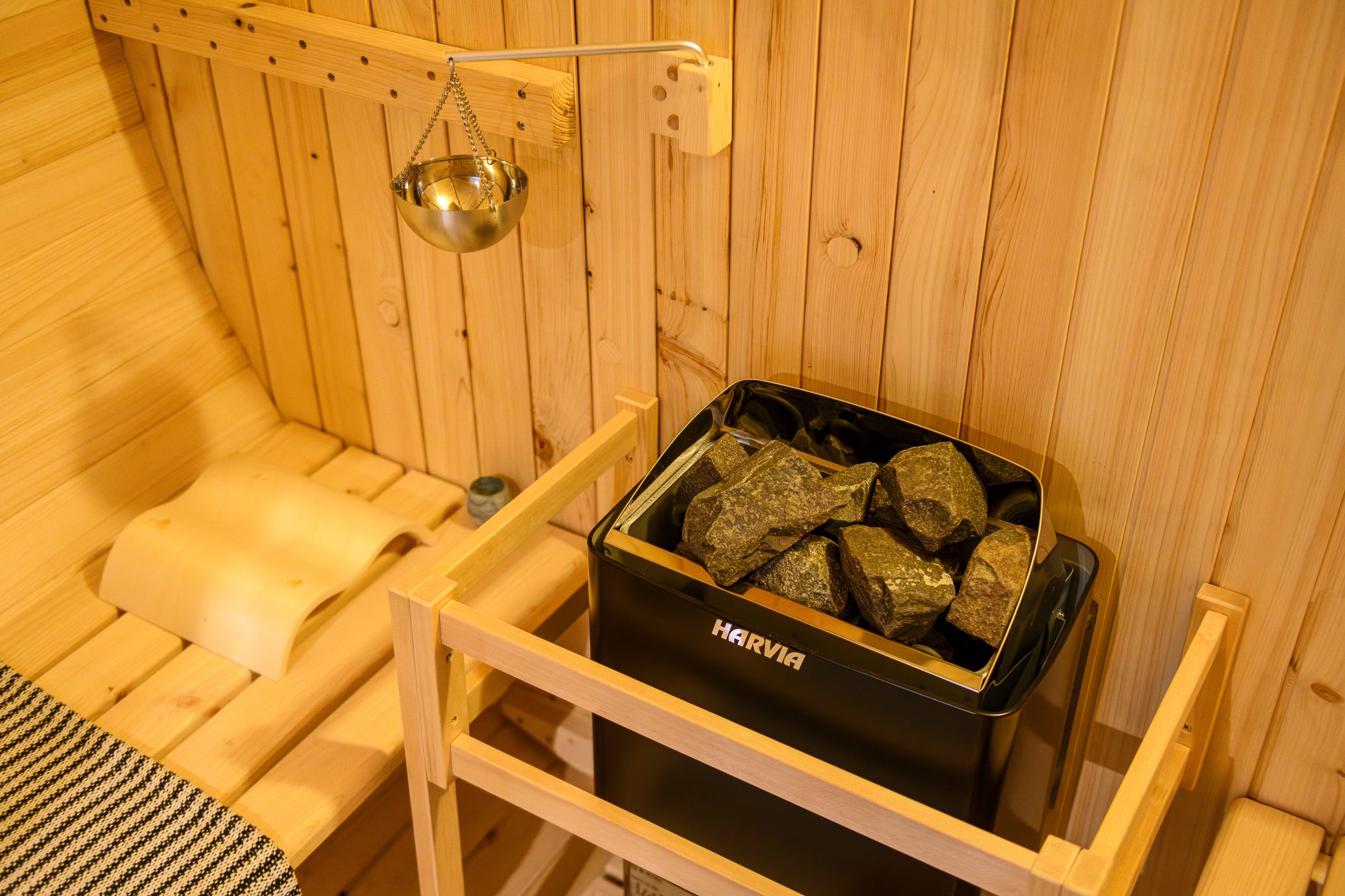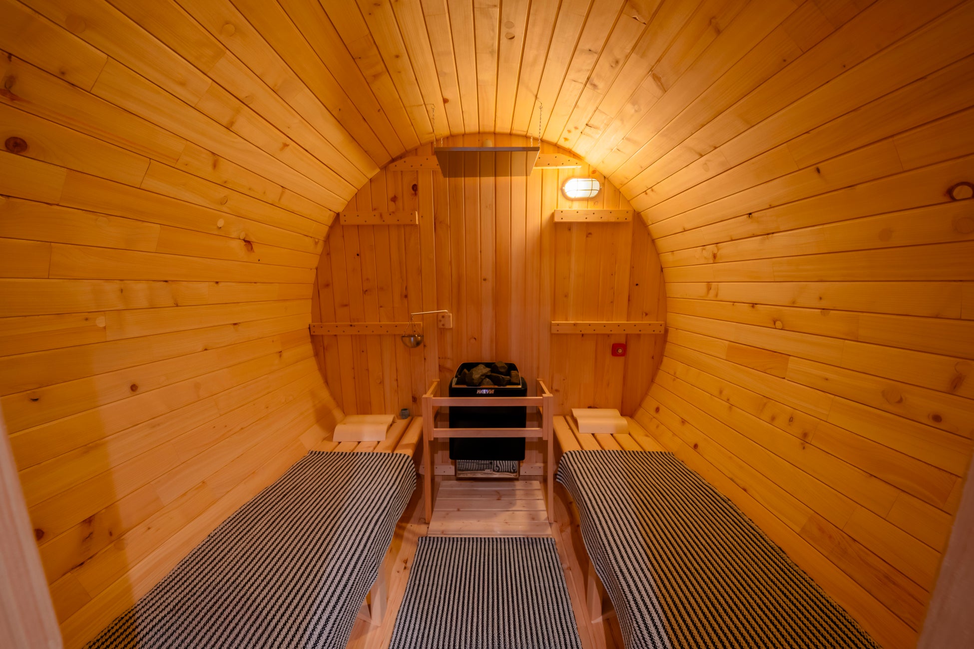 直径2100mm×全長2100mmのゆとりある設計で、Harvia社製KIP8ヒーター(7.4kW/単相200V)を搭載。セルフロウリュ対応で、檜の香りと蒸気に包まれる五感をととのえるサウナ体験をご提供します。