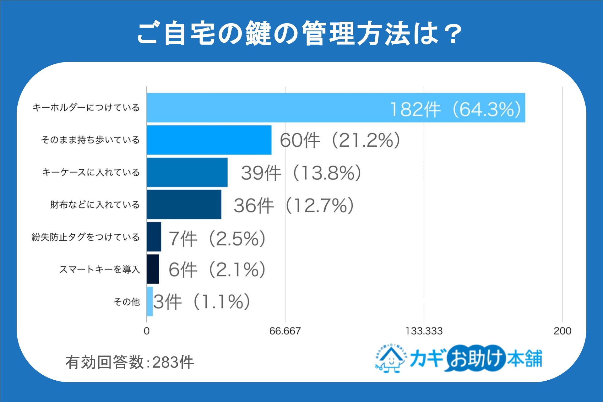 「ご自宅の鍵をどのように管理していますか?」という質問では、「キーホルダーなどにつけて持ち歩いている」が64.3%と圧倒的多数を占めました。