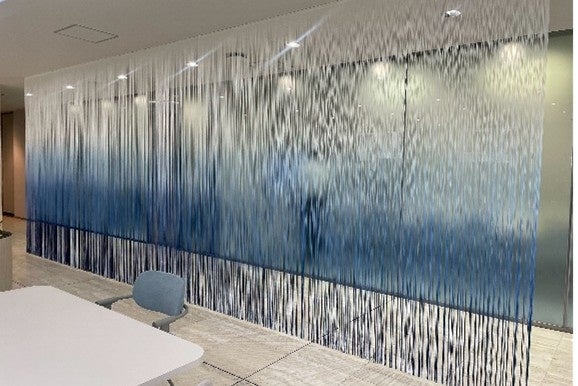今回のリニューアルでは、コンセプトとして「100年先も笑顔でいられる、ブランドとコミュニケーションを創造する場」を掲げました。水道機工の主事業である「水」を全体的なデザインイメージの軸とし、エントランスにはアクアウォールを設置しています。受付には清流の水面を思わせる光沢感を取り入れ、水の波紋をイメージしたタイルカーペットや、白から青へのグラデーションで水の透明感を表現したカーテンを採用することで、企業の歴史と事業内容を空間全体で体現しています。