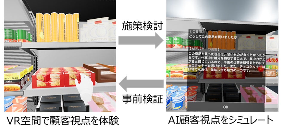 消費者の価値観を模倣した「生成AI顧客」によるVR空間での買い物体験を通じ、購買意欲を高めるような商品配置を短時間で提案し、売上向上を支援。商品の選択理由や、配置を変更した際の影響などをVR空間上で検証することが可能です。当日は、VRゴーグルを使った体験コーナーをご用意しています。