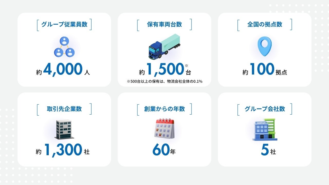 事業内容:一般区域貨物自動車運送事業、自動車運送取扱事業、倉庫の賃貸および倉庫保管業務、一般貨物の梱包に関する業務、他