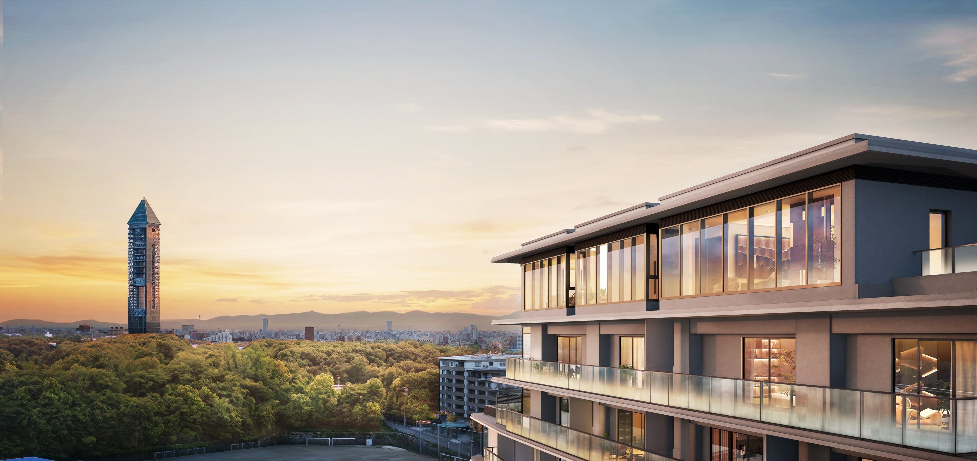 ※外観完成予想CG③は現地約36m(13階相当)の高さより西方向を撮影した写真(2025年7月撮影)に計画段階の図面を基に描き起こした建物完成予想図を合成し、CG加工したもので、実際とは異なります。 また、変更となる場合がございます。雨樋、給気口、スリーブ等、一部再現されていない設備機器がございます。また、タイル・石貼等の大きさは実際とは異なります。