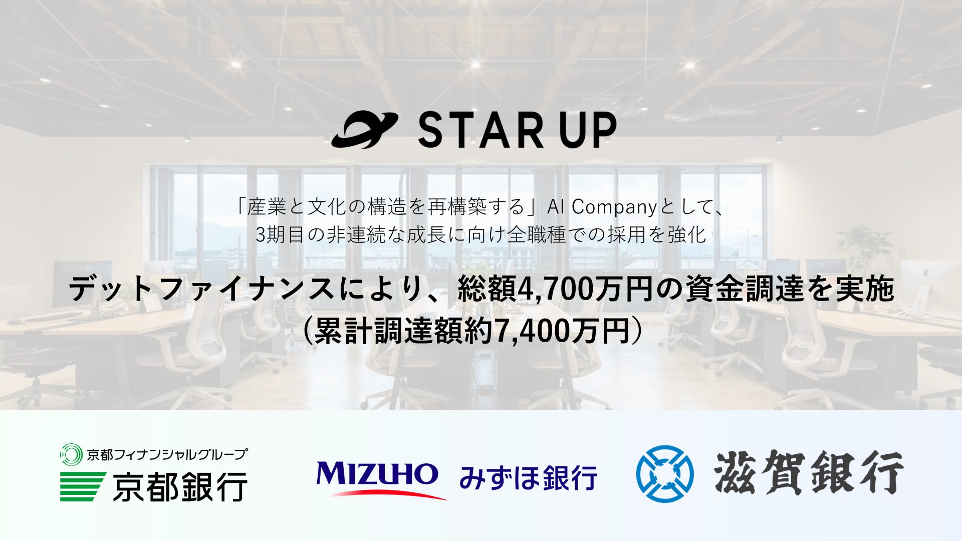 「思想をテクノロジーに変え、産業と文化の構造を再構築する」をミッションに掲げる株式会社STARUP(本社:京都府京都市、代表取締役:緒方 勇斗、以下「当社」)は、2026年2月および3月、京都銀行、みずほ銀行、滋賀銀行を借入先とする総額4,700万円の融資による資金調達(デットファイナンス)を実施致しました。これにより、累計調達額は約7,400万円となりました。