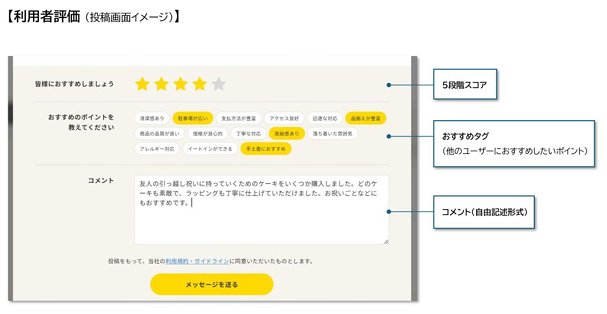 実際に利用した方の体験を参考にできるよう、以下の評価機能を搭載しました。