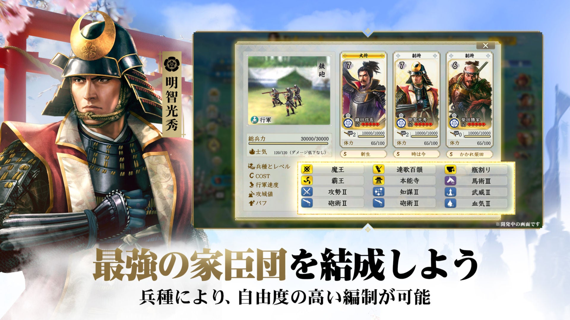 六大勢力から選び抜かれた、総勢100名以上の戦国武将を収集・育成できるシステムは、各兵種の特性を活かした編制を可能に。