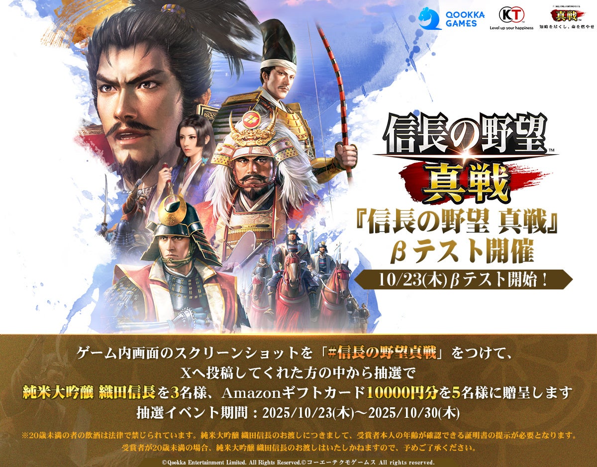 Qookka Gamesは、事前登録受付中の新作タイトルである、『信長の野望・新生』公式ライセンス、「真戦」シリーズ新作『信長の野望 真戦』のβテストを本日10月23日(木)12時より開始することをお知らせいたします。