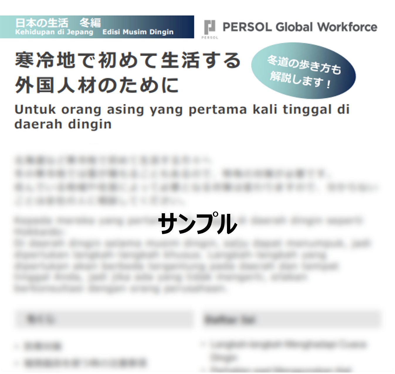 パーソルグループで外国人材に特化した人材サービスを提供するPERSOL Global Workforce(パーソル グローバルワークフォース)株式会社(本社:東京都港区、代表取締役社長:多田 盛弘)は、寒冷地で初めて生活する外国人材のためのPDF冊子「日本の生活・冬編」を制作しました。本冊子は冬道の歩き方、暖房器具を使う時の注意点、防寒対策などの冬の時期に必要な情報を日本語と外国語を併記、インドネシア語、タガログ語、ベトナム語の3つの言語を用意しています。冬の始まりと言われる立冬の本日11月7日(木)から、無料配布を開始します。