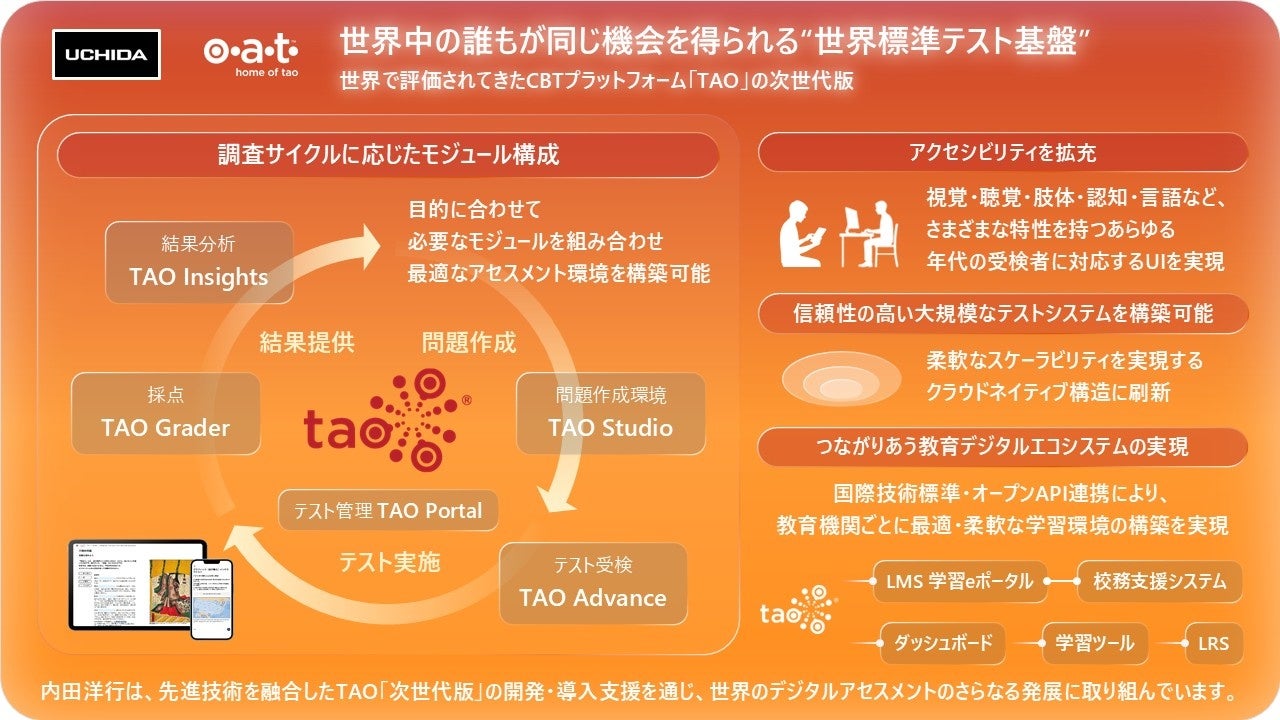 株式会社内田洋行(本社:東京都中央区、代表取締役社長:大久保 昇、以下 内田洋行)は、ルクセンブルクに本社を置くOpen Assessment Technologies S.A.(以下、OAT)と共同で開発する 次世代版CBTプラットフォーム「TAO(タオ)」のフルラインナップを世界に先駆けて日本で発表します。
