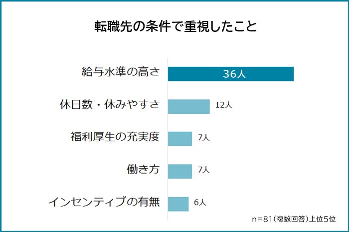 転職先の条件で重視したことの圧倒的1位は「給与水準の高さ(36人)」です。以下、2位「休日数・休みやすさ(12人)」、同率3位「福利厚生の充実度(7人)」「働き方(7人)」、5位「インセンティブの有無(6人)」の結果でした。