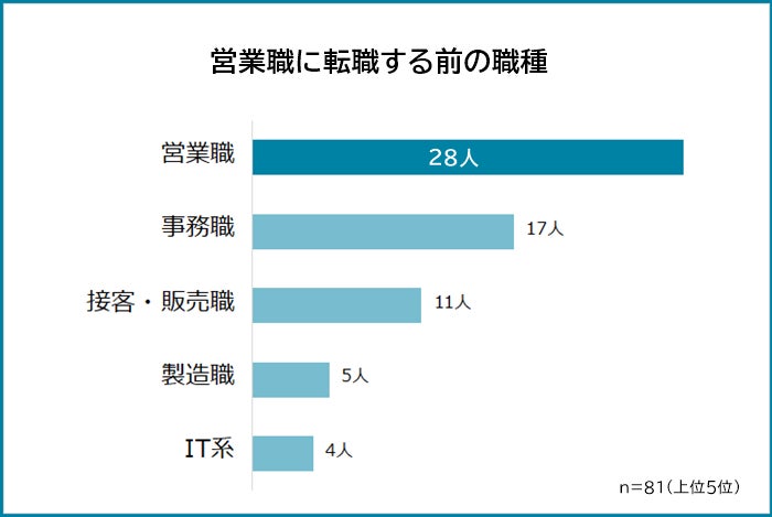 営業職への転職経験がある81人に「転職前の職種」を聞きました。その結果、転職前の職種も営業だった人が28人で、全体の3割強となりました。