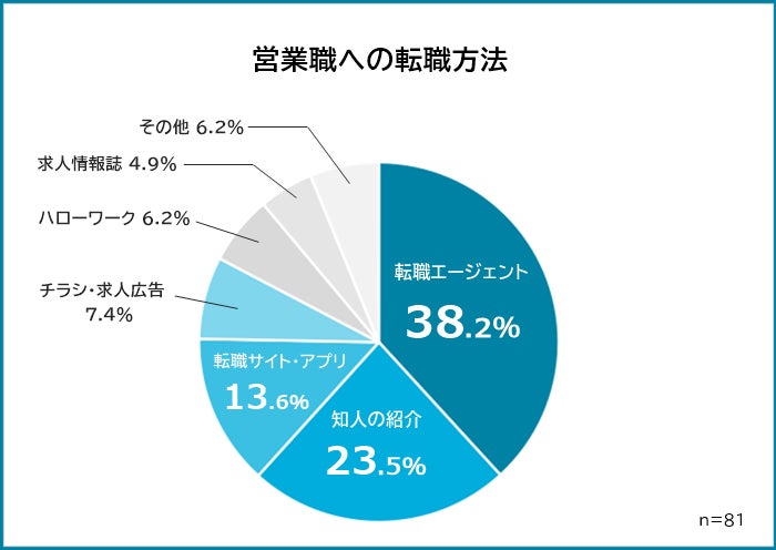 どのような方法で営業職に転職したかを聞いたところ、「転職エージェント(38.2%)」が最も多くなりました。