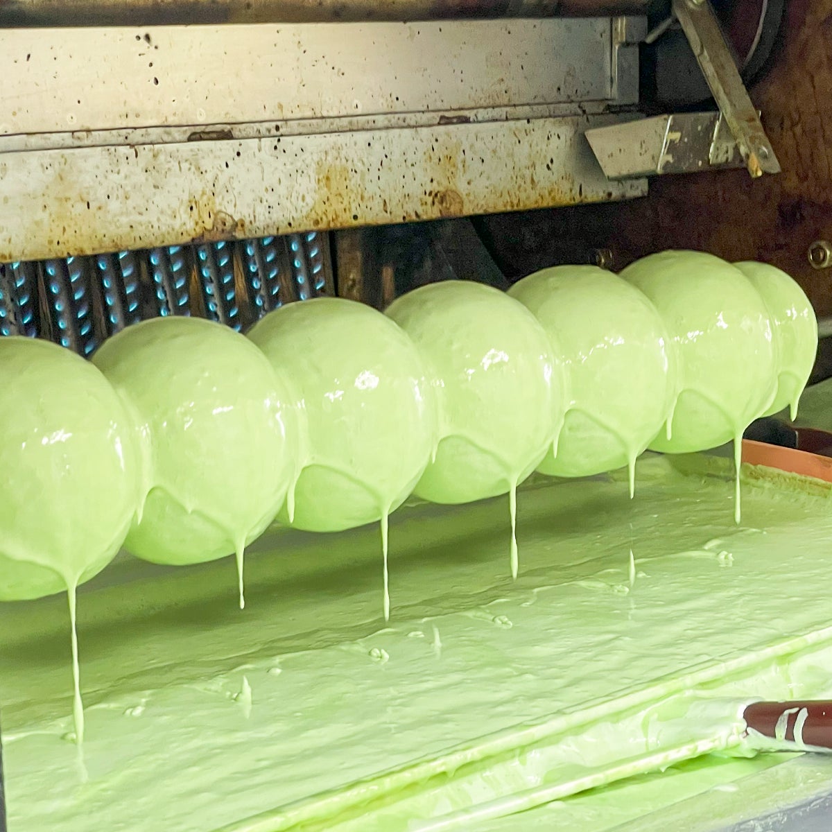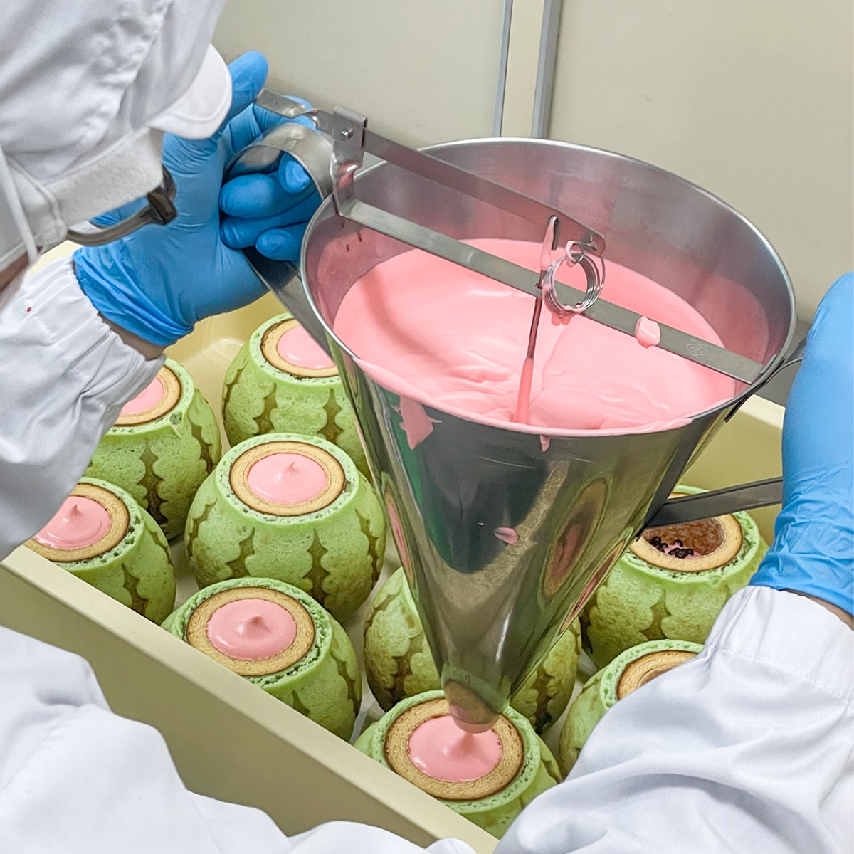 見た目のインパクトと味のギャップで話題沸騰中の「すいかバウム」は、完成までに3日間を要する職人技の結晶。1回の製造で作れるのは、わずか90個。手間ひまを惜しまないその希少性も、多くのファンを惹きつけています。