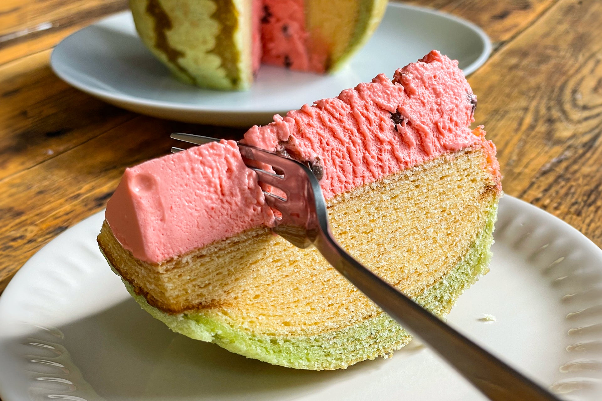 「スイカ持ってきたよ!」と取り出した瞬間に、「えっ!? これケーキ!?」と笑いがこぼれる、サプライズ感たっぷりのスイーツです。