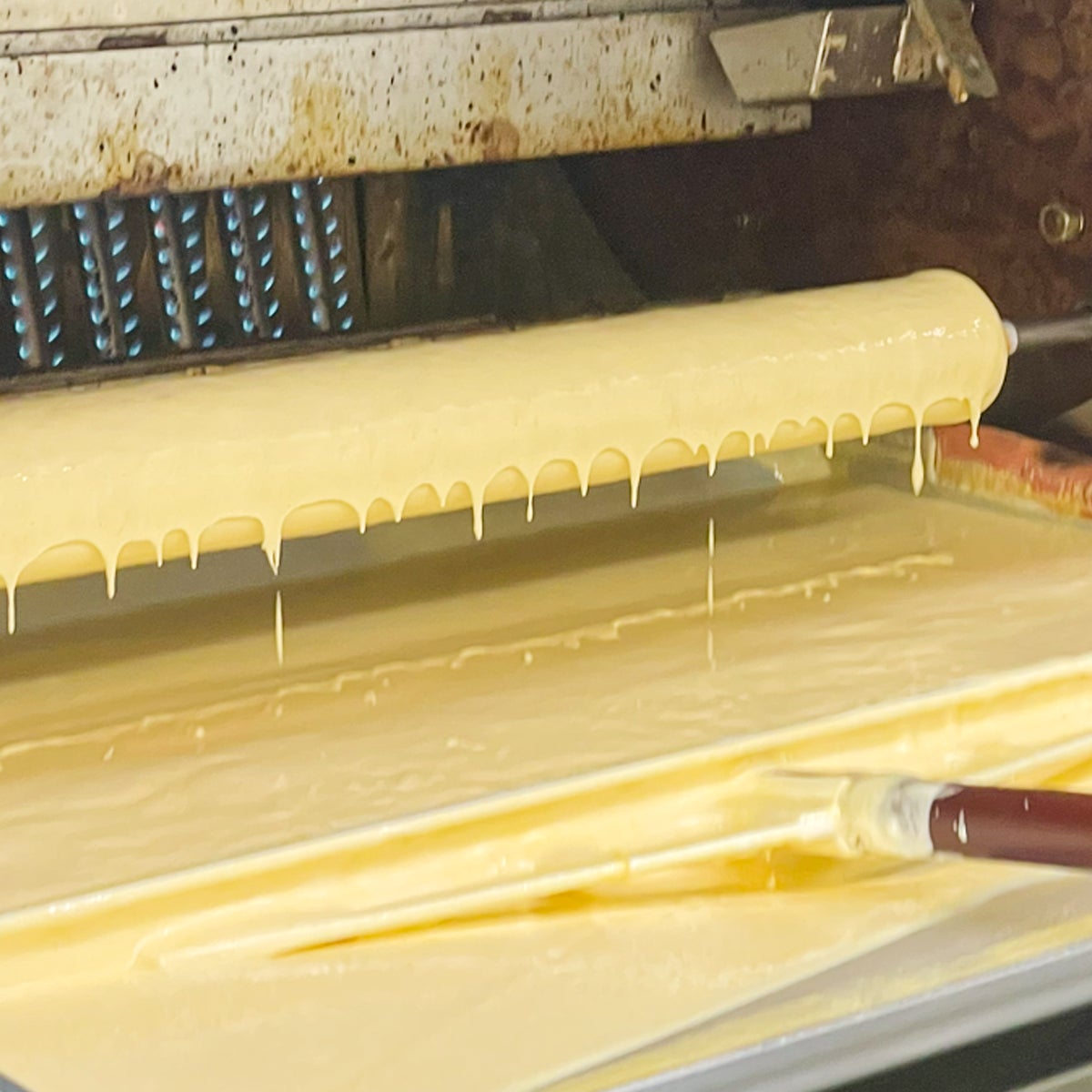 開発にあたって私たちが掲げたのは、「千葉県の米でスイーツを作りたい」「千葉県の農家さんを応援したい」という“千産千消”の想い。その思いを形にするべく、千葉県産の米粉を100%使用した米粉バウムクーヘンの開発に挑みました。