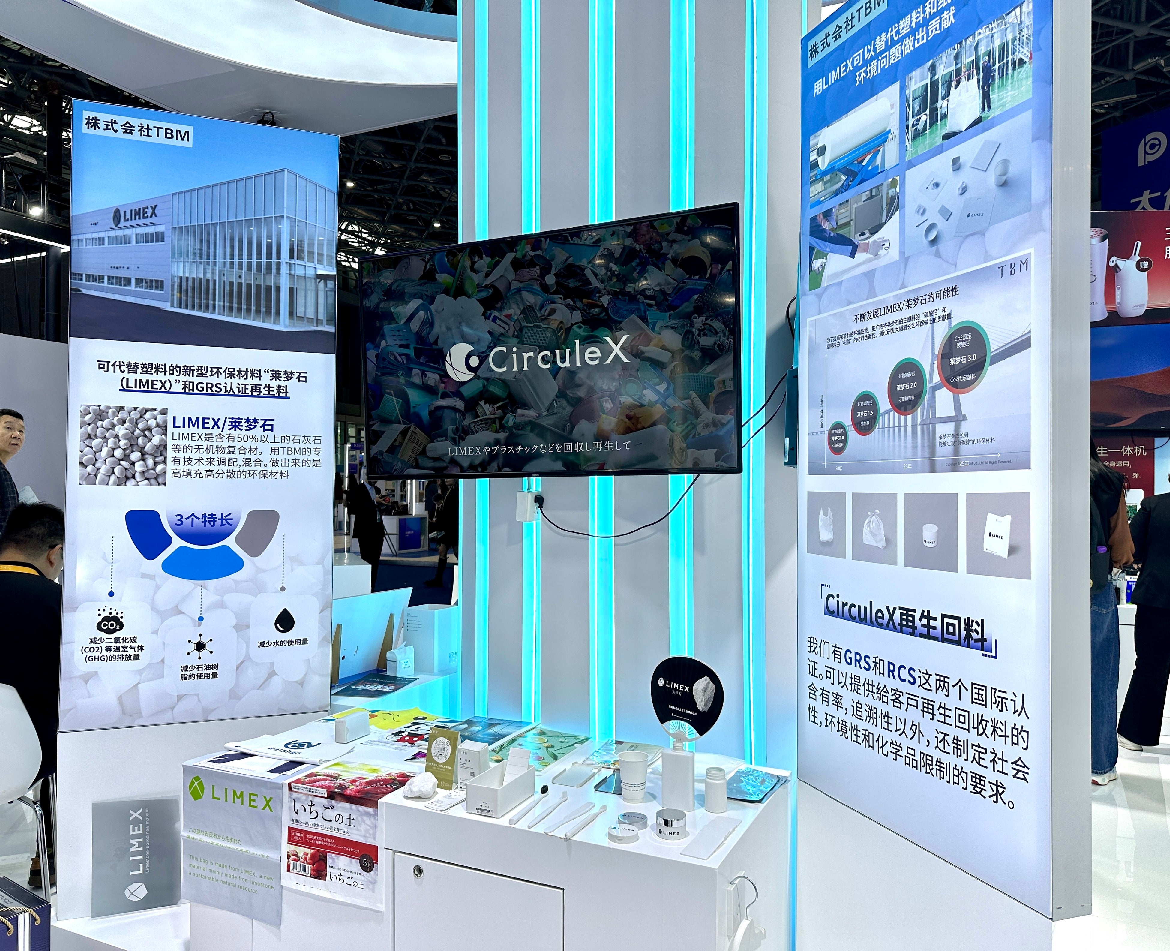 今回の輸入博では、ジャンシン匠新の長年のパートナーである株式会社TBM(以下「TBM」)を招待した。TBMは新材料LIMEXの研究開発、製造、販売に特化しており、環境に優しく持続可能なソリューションを世界に提供することを目指している。LIMEXは主に石灰石を使用した新材料であり、50%以上の石灰石(CaCO3)などの無機物を含む無機充填剤分散系複合材料である。石油樹脂の代替だけでなく、生産過程でほとんど水を使用せず、従来の紙の生産方式に代わる素材として、石油、水資源、森林など枯渇しやすい自然資源を保護することが可能である。TBMは今回の展示会を通じて、さらに多くの日中協力パートナーと関係を築き、持続可能なイノベーション技術を中国および世界に広く普及させ、地球環境保護に貢献することを目指している。