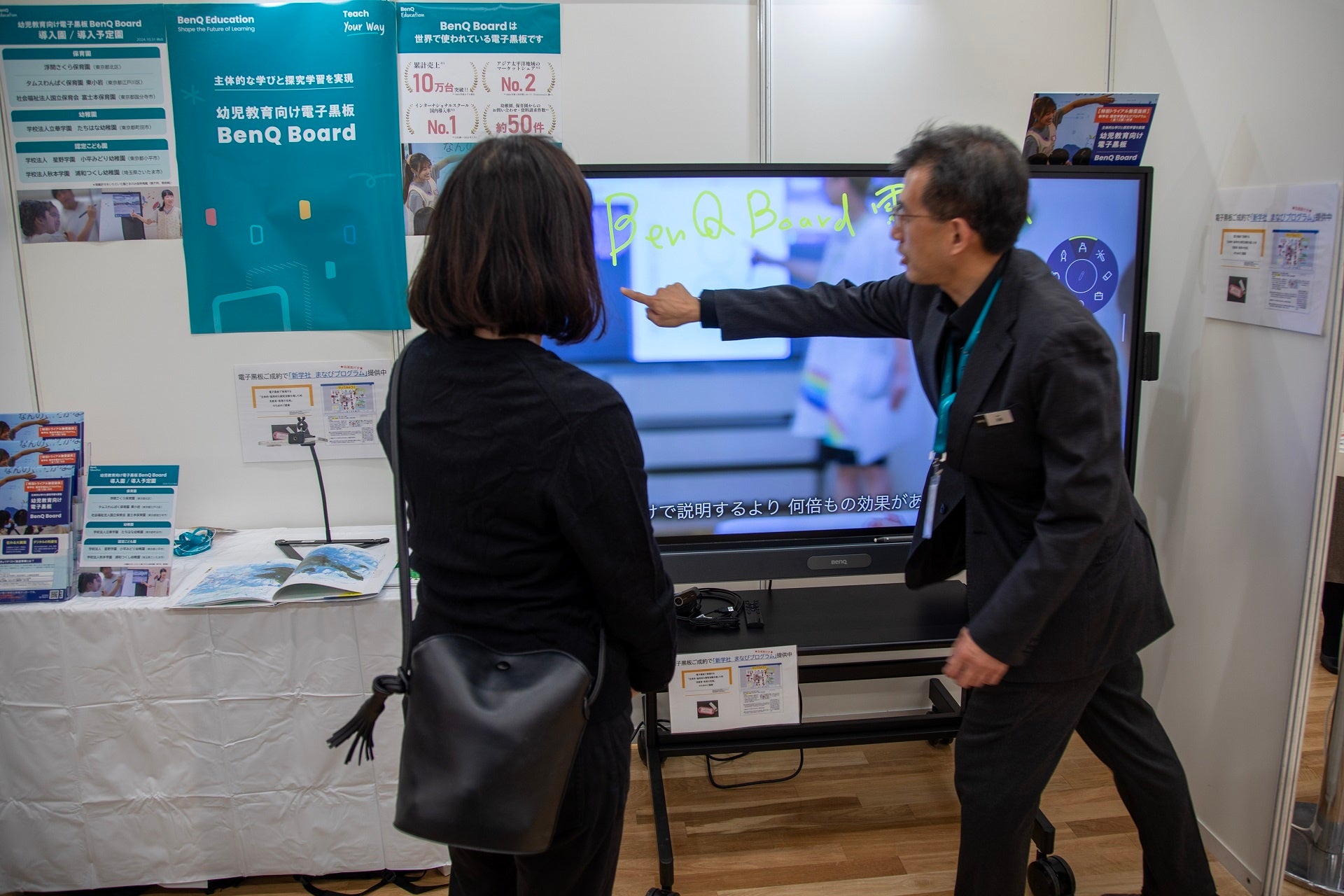 BenQブースでは、保育の現場にて注目度の高まりつつある幼児教育向け電子黒板「BenQ Board」を展示。ブースを訪れる来場者に対して、デモンストレーションを交えながら、実際の使用感などを伝えました。