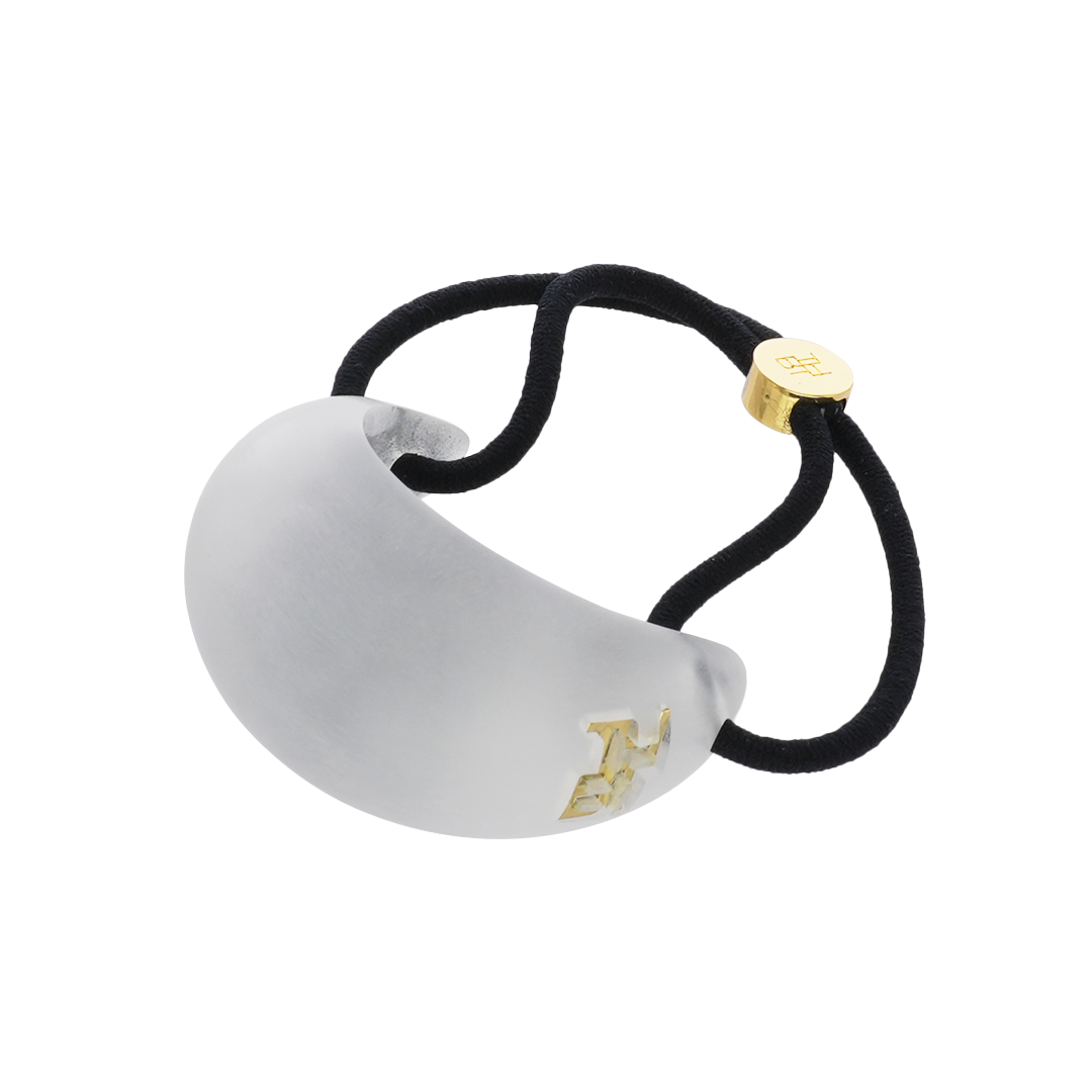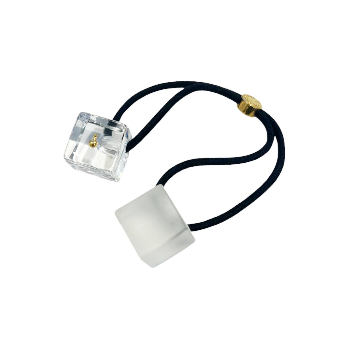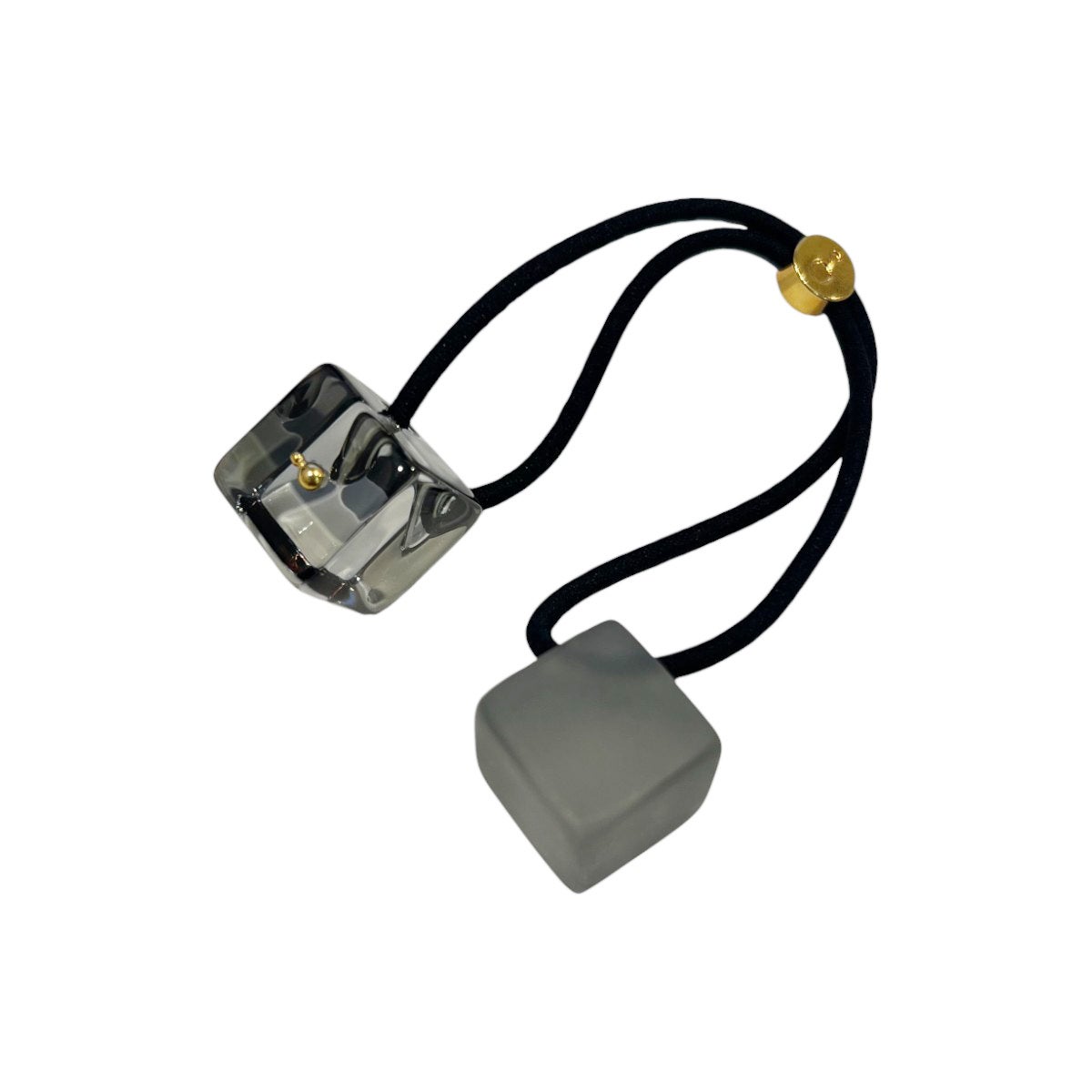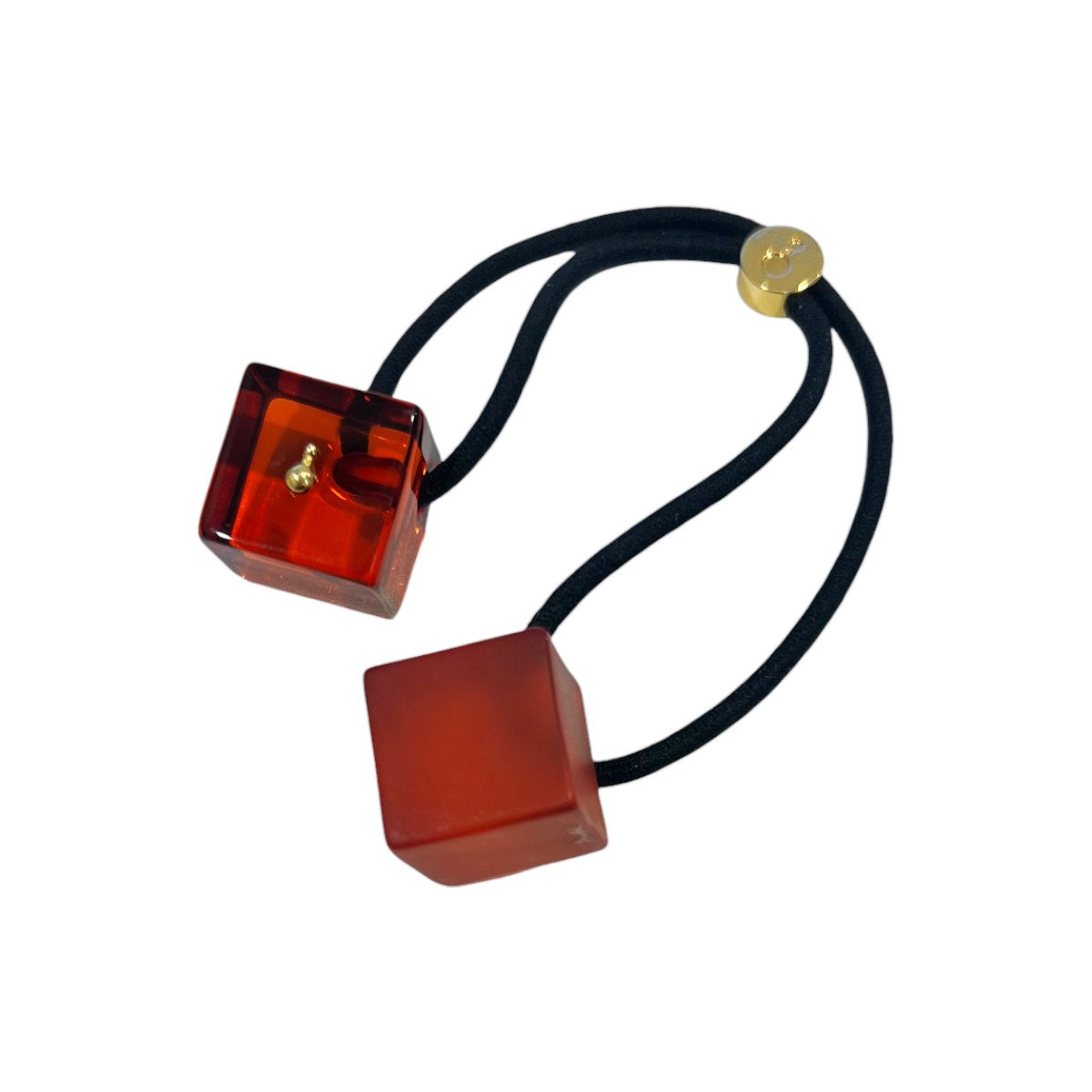 <THE HAIR BAR TOKYO>オリジナル、ダブルキューブポニー。レッド、スモーク、クリアの3色を展開し、オーナメントの一方はクリア、もう片方はフロステッドと、ツインポニーならではの遊び心が効いています。2つのオーナメントを重ねてシンプルに結ぶだけでなく、シニヨンの周りをラッピングしたり、ループを分けて結ぶバブルポニースタイルなど、アイディア次第でさまざまなスタイルが楽しめます。キュートでユニークなデザインはギフトにもおすすめです。