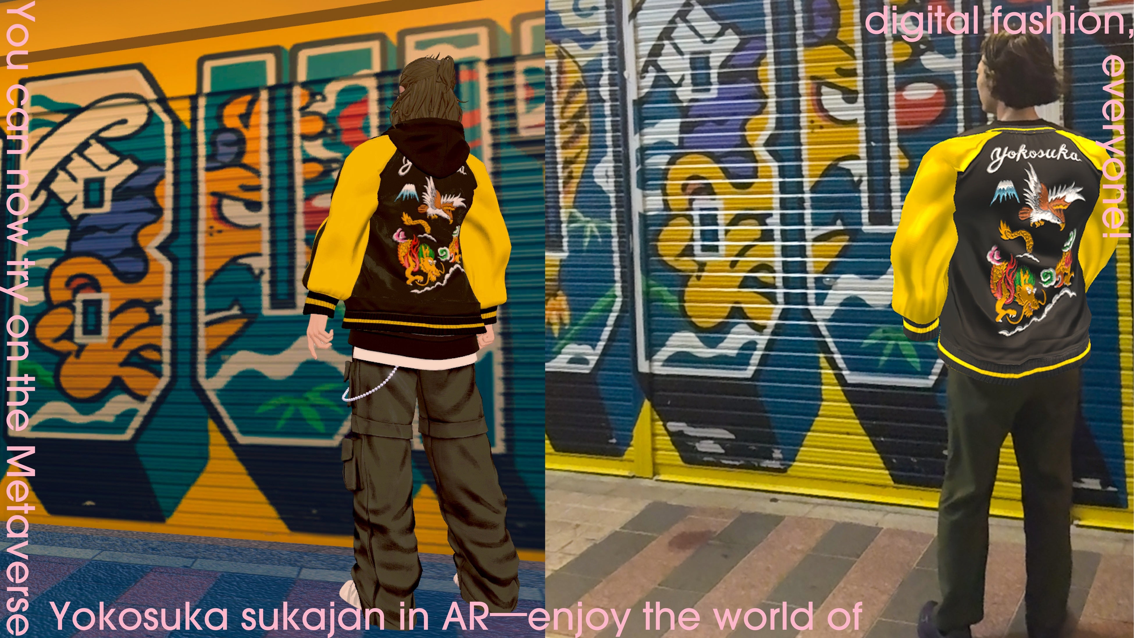 メタバース空間での楽しみ方に加え、AR技術によって「現実世界」で誰もが手軽にスカジャンを身にまとう体験を提供します。 その体験の写真や動画がSNSで共有されることで、スカジャンそのものへの関心を高めるとともに、より多くの方に横須賀カルチャーとデジタルファッションの魅力を届ける事を目指します。