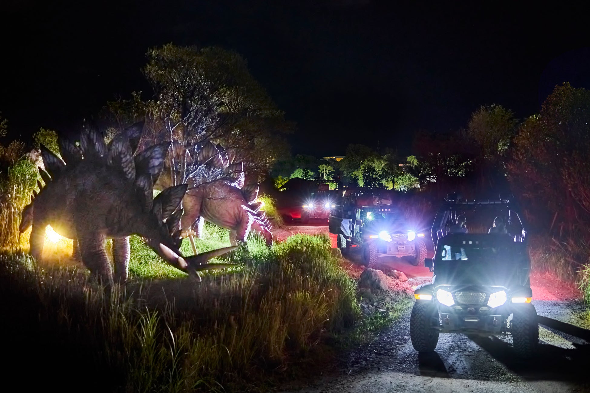 夕闇からの「ダイナソー サファリ(ナイトバージョン)」は、月明かりやライトの光を頼りに恐竜たちの生息するエリアへ進入。夜の静けさの中、暗闇から現れる恐竜たちの影や声にスリルが増し、デイタイムとは異なる非日常な空間に高揚感が高まります。突如姿を現すT-Rexを目の前に車両は一気に加速し、真っ暗なオフロードをワイルドに駆け抜ける!デイタイムの体験では味わえない、闇と光がつくるナイトアドベンチャーを体験できます。