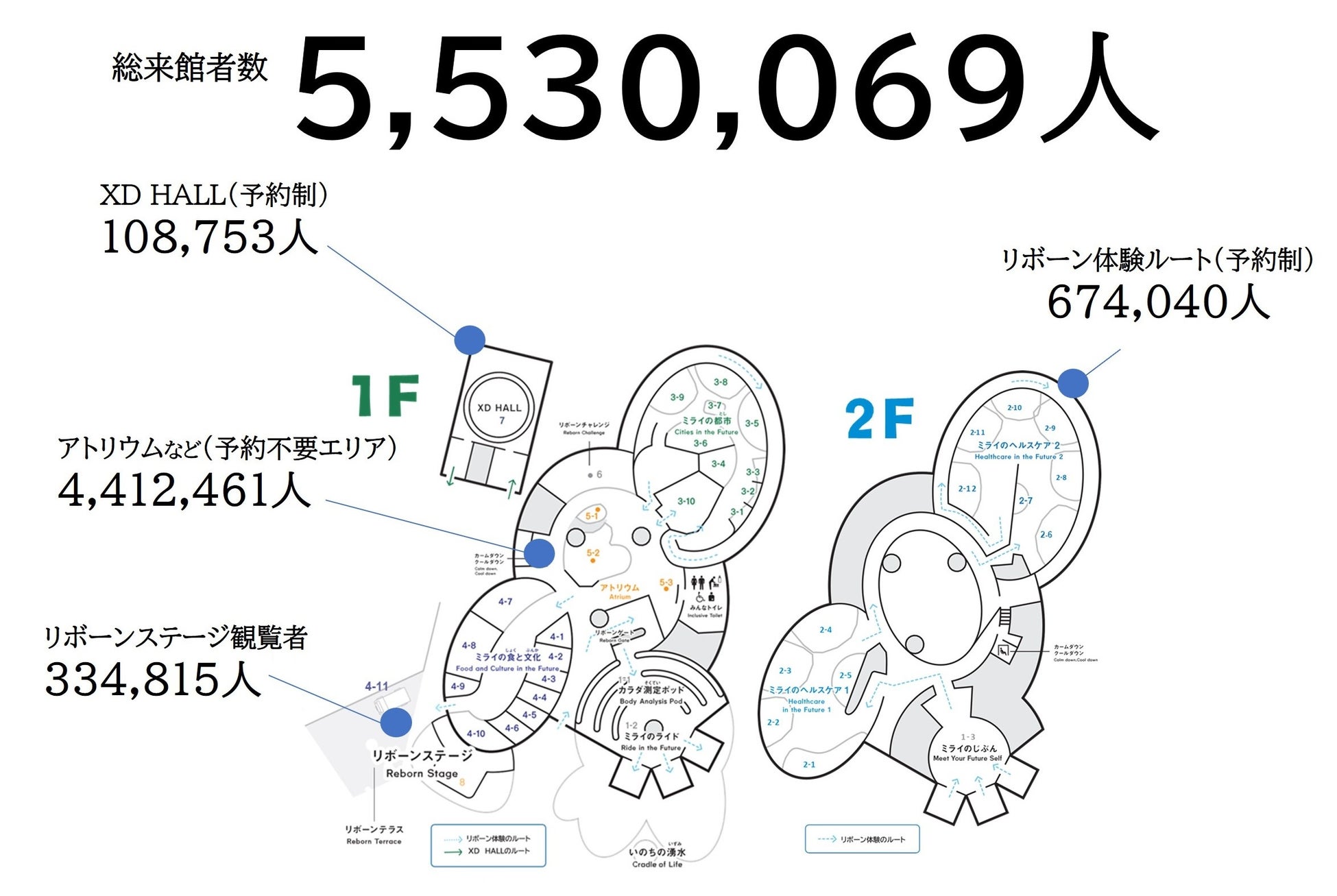 会期中の来館者数は、出展基本計画での想定来館者数280万人を大きく上回り、約553万人にご来館いただきました。(来館者の内訳は、リボーン体験ルートが約67.4万人、XD HALLが約10.8万人、アトリウム等(予約不要エリア)が約441.2万人、リボーンステージ観覧者が約33.4万人) 多くの方々が訪れてくださったことに感謝申し上げるとともに、当パビリオンでの体験が、新たな自分へ生まれ変わり、今後の活動の新たな原動力を得て、力強くミライへと進んでいただけることを願っています。