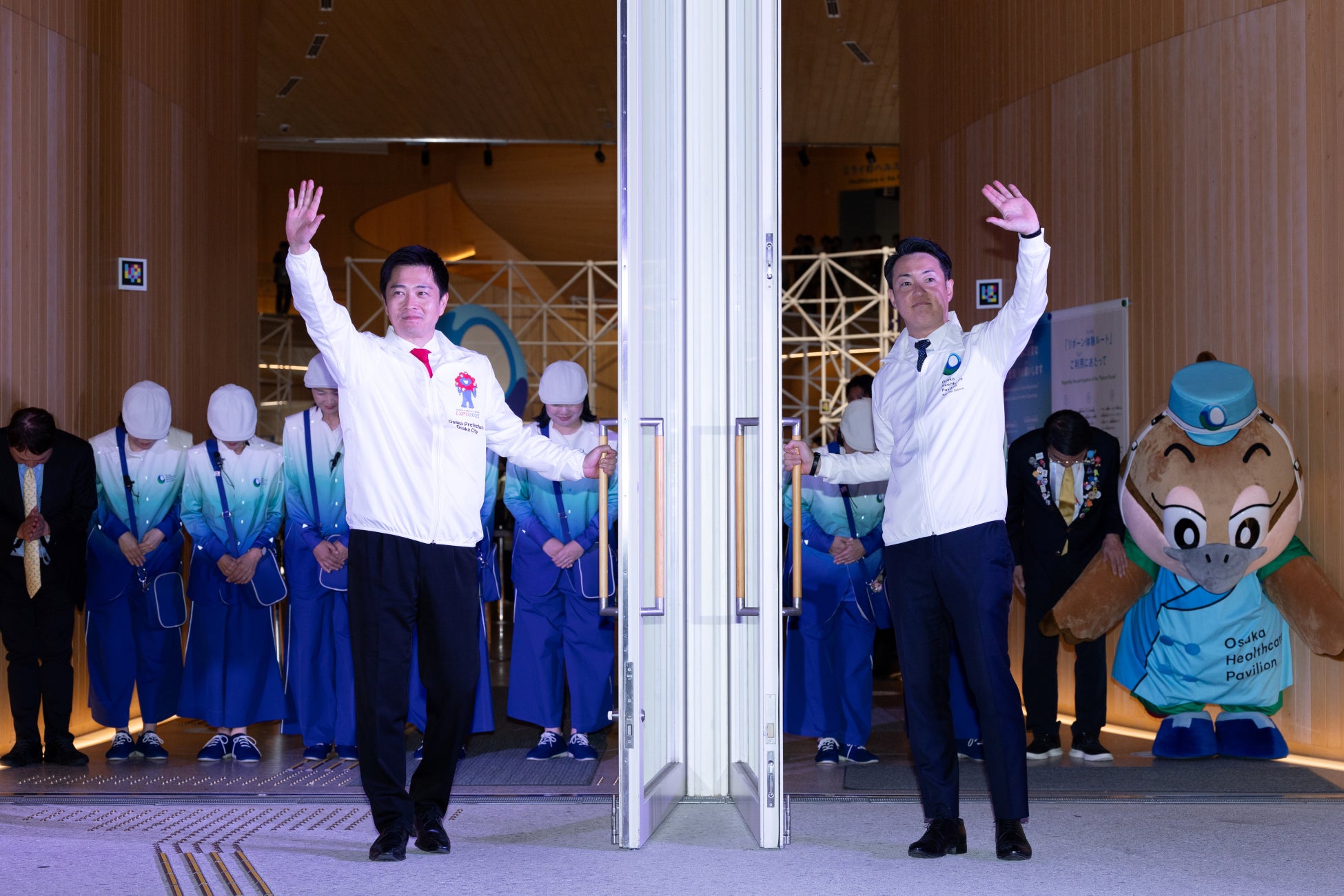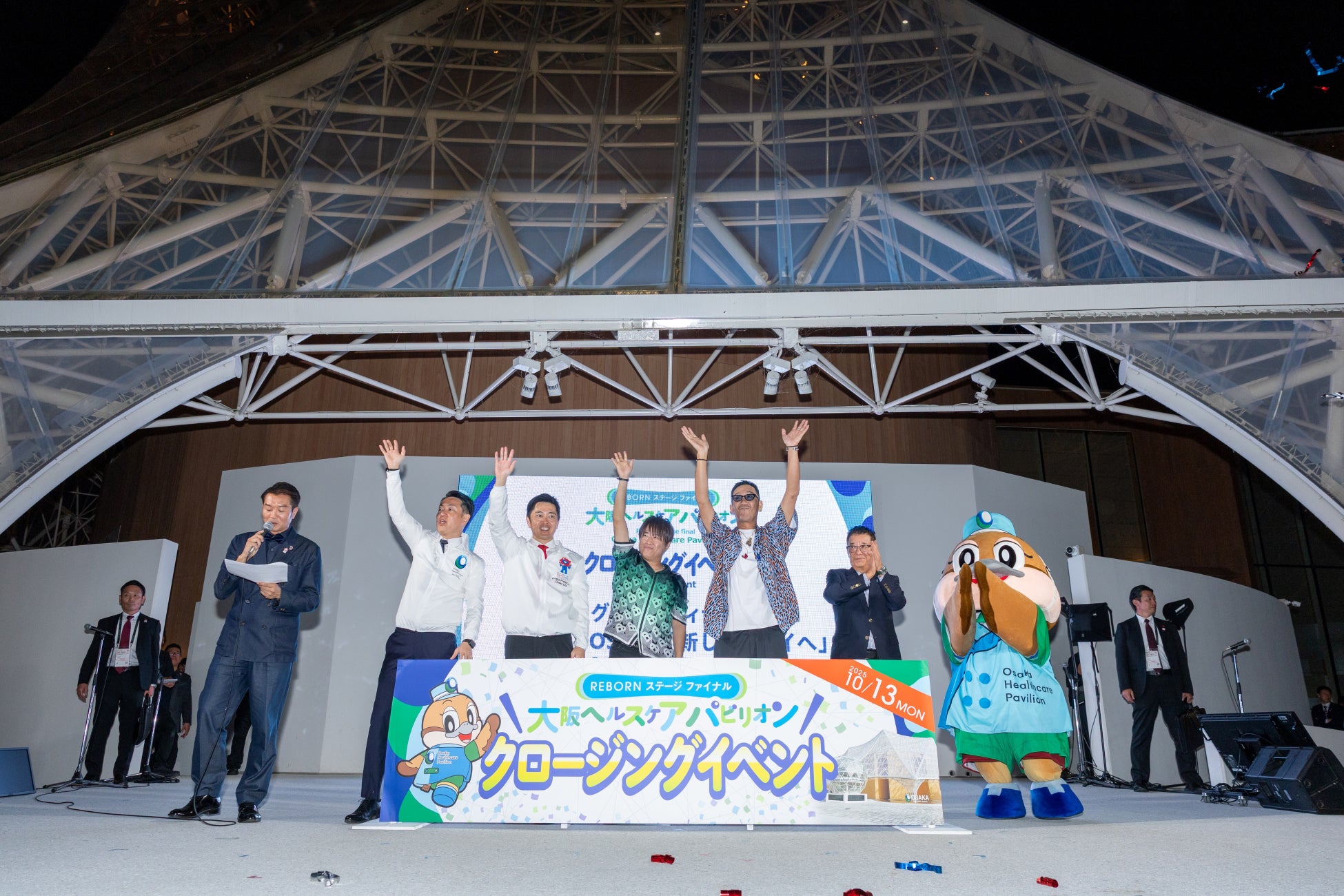 また、吉村知事・横山市長が大阪ヘルスケアパビリオンエントランスにて最後に入館するゲストをお迎えするクロージングセレモニー」、続いて来館者を誘導・お迎えしてきたアテンダントや協賛企業などの運営スタッフら500名以上が参加する「クロージング感謝セレモニー」を執り行い、吉村知事から「(終わるのは)寂しいが、ここで得た人と人とのつながり、経験は何事にも代えがたい一生の思い出になったと思います。この思い出を大切にしましょう」、横山市長から「アテンダントの皆さんはどんなときも笑顔でお客様を迎え入れてくださり、お客様を笑顔にしてきた。その笑顔が何よりのレガシーだと思う。大阪ヘルスケアパビリオンで展示されたものはこれから社会実装が進んでいく。万博はまだまだ続きます。この夢の未来を一緒に描いていきましょう」と184日間無事に走り切ることができたことへの感謝と今後への思いが伝えられました。
