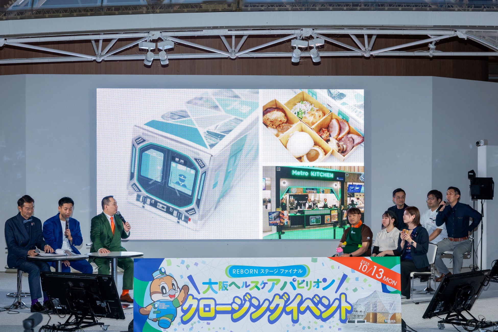 第2部では、「ありがとう、ミライ社会」をテーマに、ゲストMCにお笑いコンビ・ミルクボーイの駒場さん・内海さんを迎え、大阪ヘルスケアパビリオンに出展する企業34社が登壇し、これまでの苦労や印象に残った出来事など、スタッフ側の目線で大阪ヘルスケアパビリオンを振り返るトークセッションを行いました。