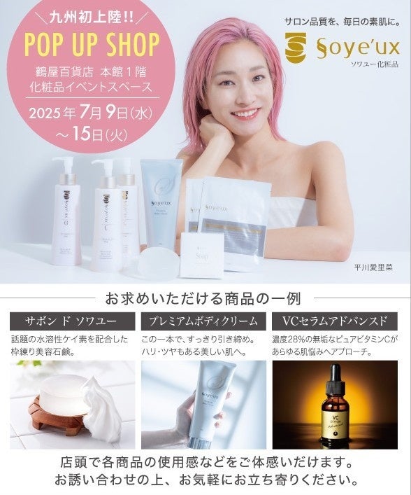 株式会社リッシュプラス(本社:愛知県名古屋市、代表取締役社長:泊 剛史)は、直営エステサロン「リンリン」「レグルスゼロ」がプロデュースする、自然派ドクターズスキンケアブランド「ソワユー」のポップアップショップを鶴屋百貨店(熊本県熊本市)にて、2025年7月9日(水)から2025年7月15日(火)まで期間限定でオープンします。