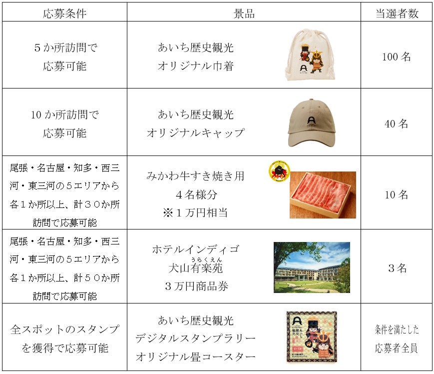 ・巡ったスポット数に応じて、抽選でホテルインディゴ犬山 有楽苑(うらくえん)の商品券や、愛知県産和牛「みかわ牛」(すき焼き用4名様分)などの豪華賞品が当たります!