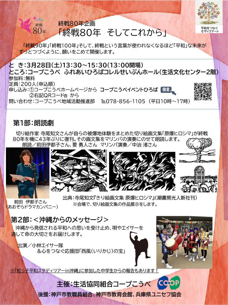 生活協同組合コープこうべは昨年、話題となった兵庫県養父市出身の絵作家 寺尾知文さんが自らが兵隊として被爆地ヒロシマでの体験をまとめた「きり絵画文集『原爆ヒロシマ』」の朗読劇を3月28日(土)に開催します。会場ではマリンバの演奏(中治 渚さん)にのせて、俳優の前田 伊都子さん(あおぞらドラマカンパニー)、要 勇人さんが朗読します。