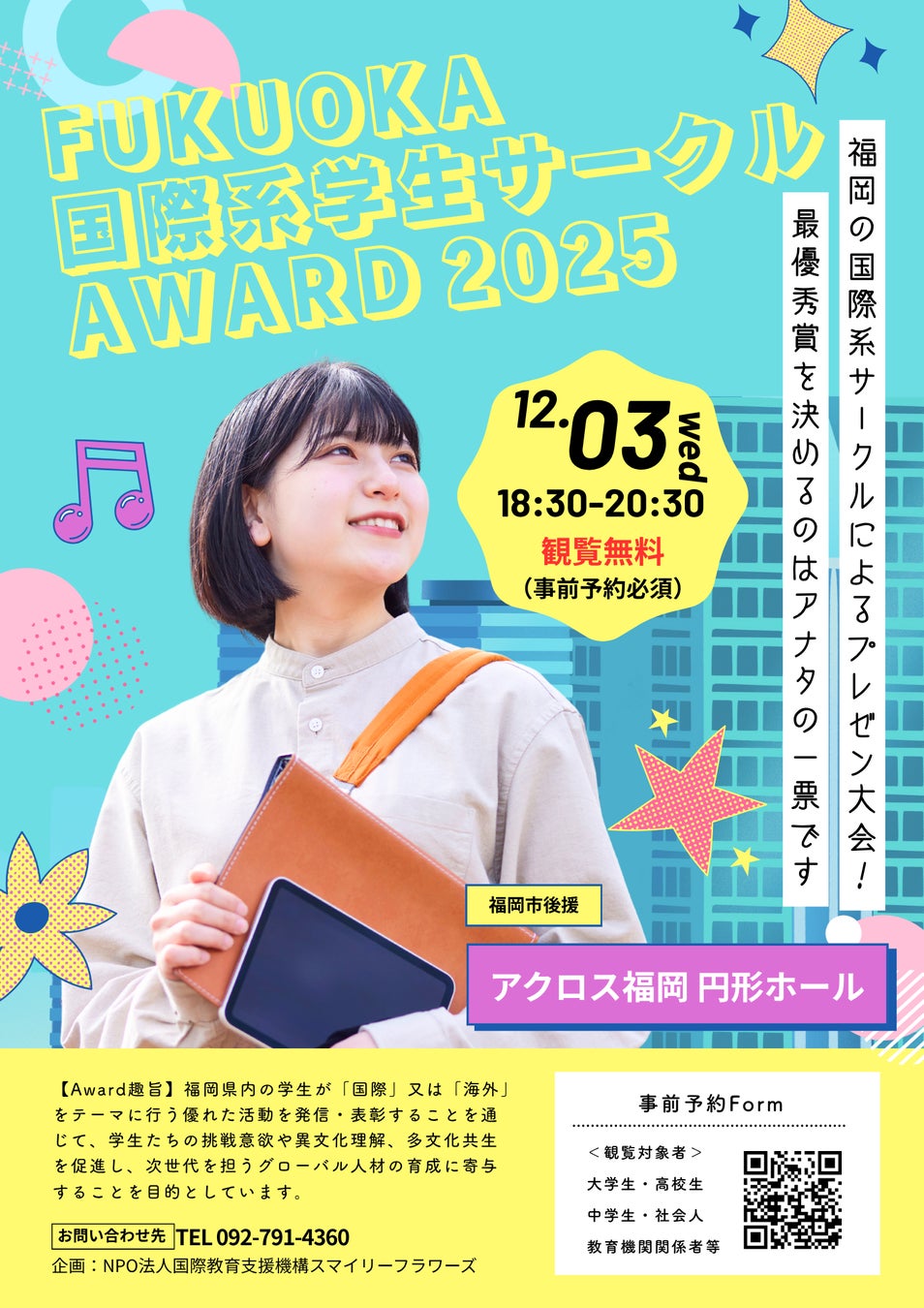 特定非営利活動法人 国際教育支援機構スマイリーフラワーズ(福岡市中央区/代表理事:窪田 広信)は、2025年12月3日(水)にアクロス福岡 円形ホールにて初開催する「Fukuoka 国際系学生サークル Award 2025」の登壇団体が決定しました!