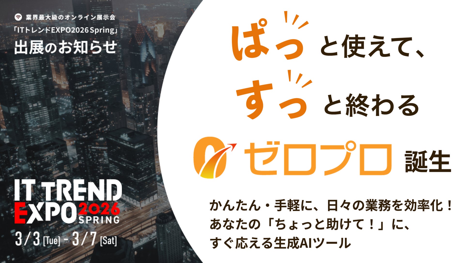 株式会社ISTソフトウェア(本社:東京都大田区蒲田5-37-1、代表取締役社長:瀬端 伸一)は、2026年3月3日よりオンラインにて開催される「ITトレンドEXPO 2026 Spring」に、新サービス:プロンプト・チャット不要の生成AIツール『ゼロプロ』を出展いたします。