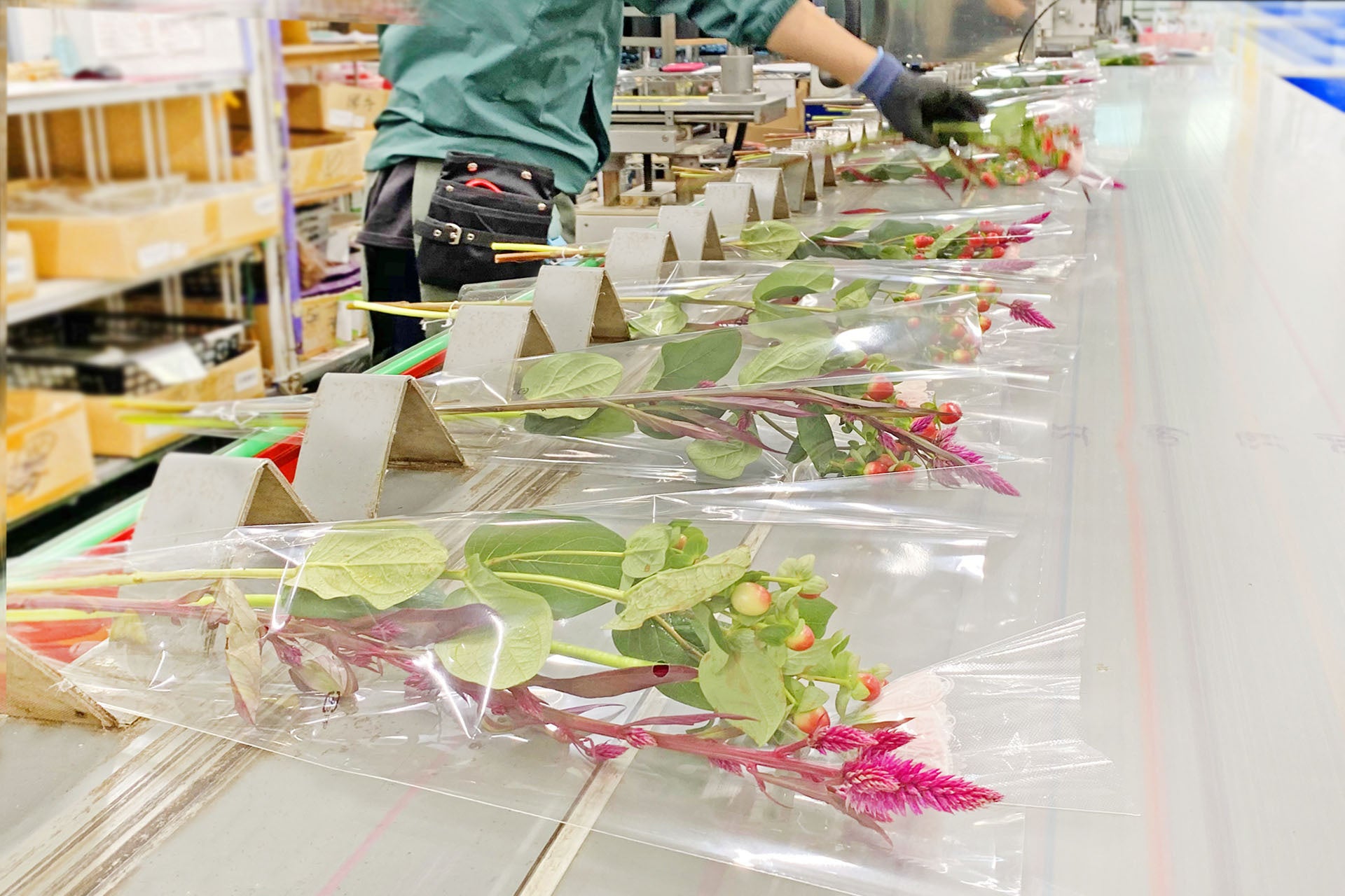そして昭和63年(1988年)7月 株式会社メルシーフラワーが設立され、平成元年(1989年)には日本で初めて花束製造ラインを導入し、花の下処理設備や冷蔵庫も整え“花束加工工場(ブーケメーカー)”としての体を成すにいたりました。このころから、本格的にスーパーマーケットでの花のセルフ(委託)販売を拡大していきます。