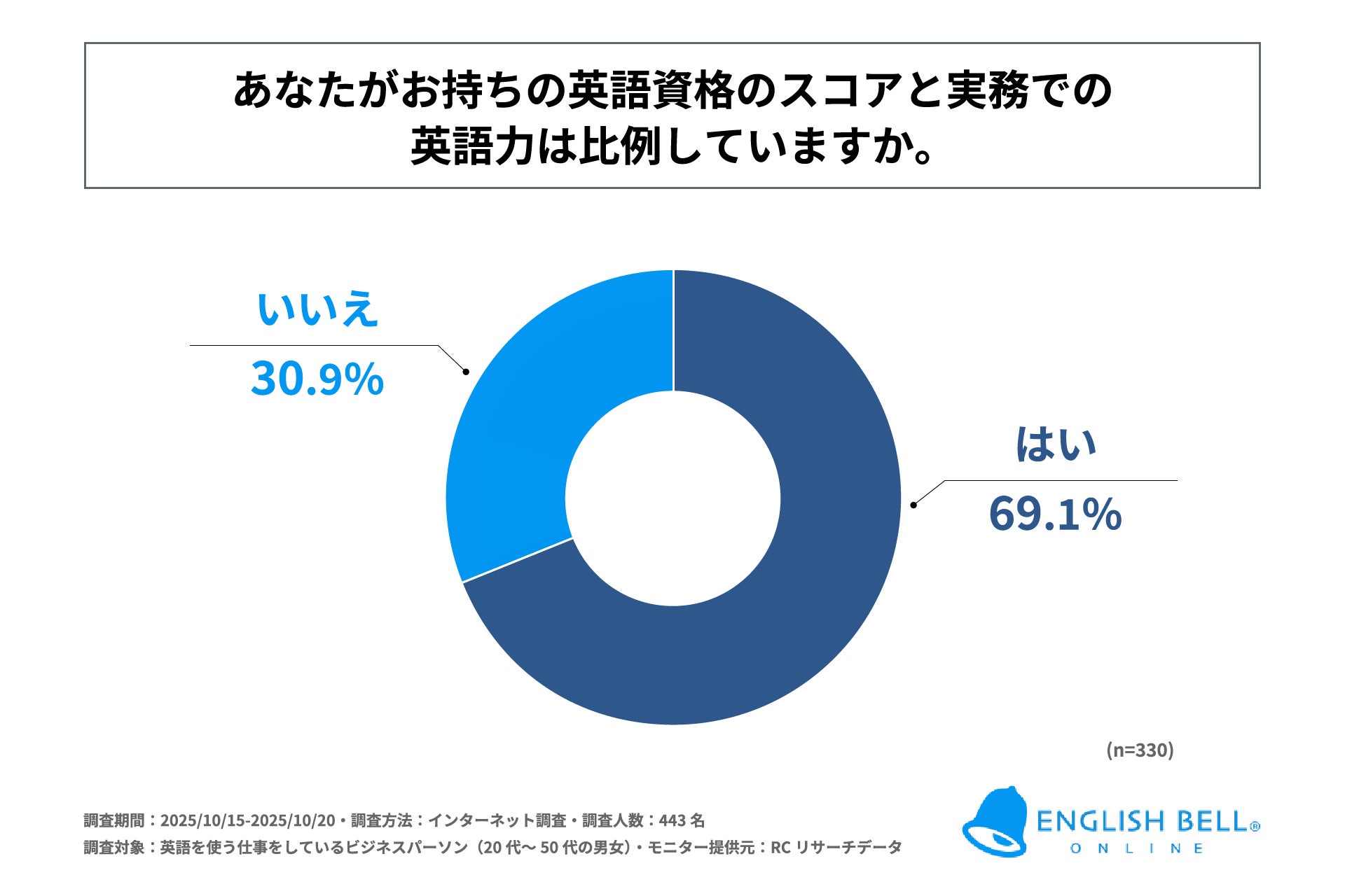 また、英語資格を持っていると回答した人を対象に「持っている英語資格のスコアと実務での英語力は比例しているか」を尋ねる設問への回答では、「はい」が69.1%、「いいえ」が30.9%という結果になりました。この結果から、英語資格を持ち英語を使う仕事をしているビジネスパーソンの約7割が、自身の英語資格のスコアと実務での英語力は「比例している」と感じていることが明らかになりました。
