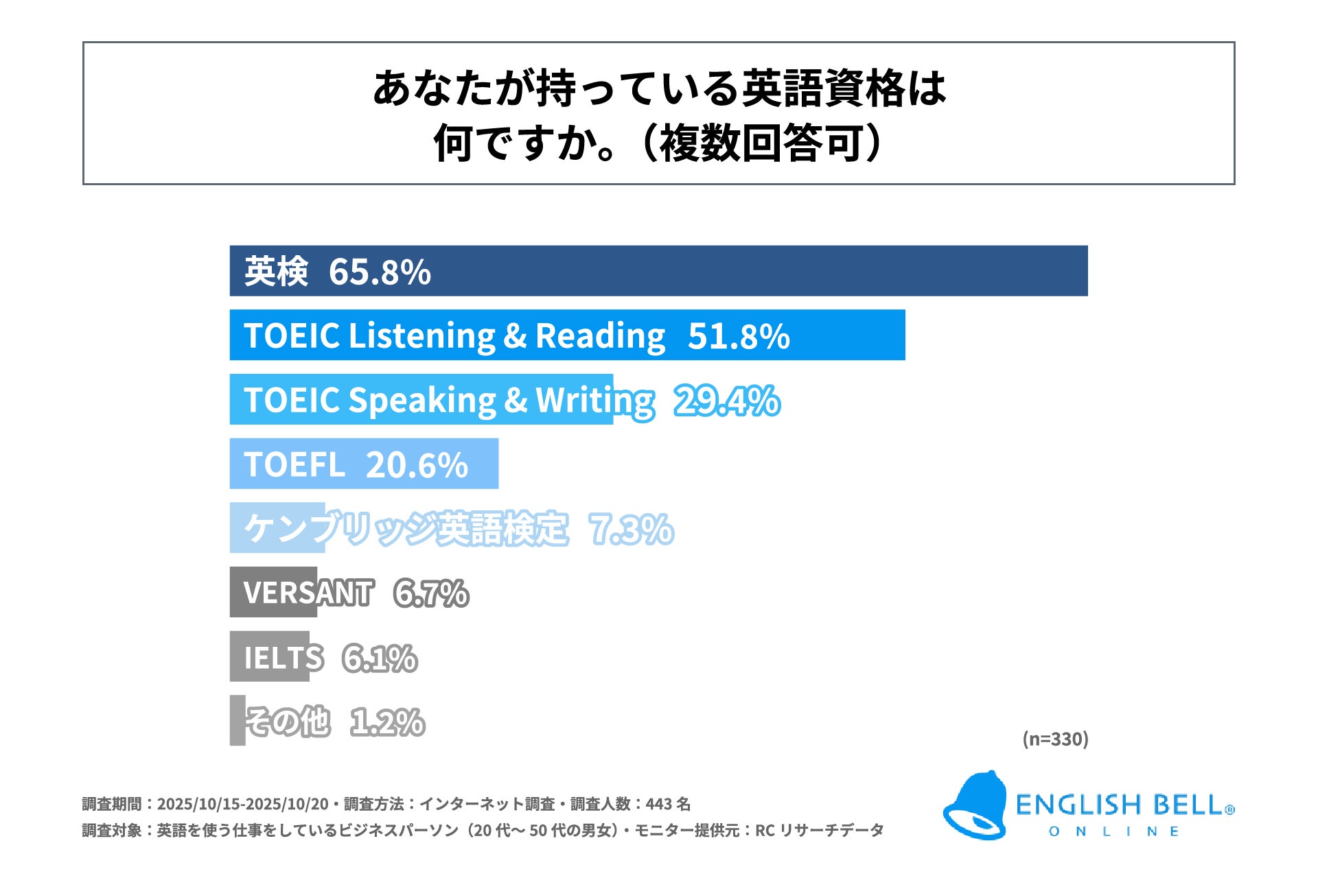 グローバル化の進展やリスキリングの重要性が叫ばれる中、ビジネスパーソンの英語力、特に「実務で通用する英語力」への注目がこれまで以上に高まっています。多くの企業が採用や昇進の基準として英語資格のスコアを参考にする一方、「資格のスコアだけでは、実際の業務遂行能力は測れない」というジレンマも存在しているものと考えられます。また、従来はTOEICが圧倒的な知名度を誇ってきましたが、近年ではビジネス現場での実践的なスピーキング能力を測るVERSANTや、海外赴任・留学などで用いられるIELTSなど、資格試験も多様化しています。このような状況下で、実際にビジネスの最前線で英語を使っている人々は、どの資格を「本当に仕事に役立つ」と考え、どのように評価しているのでしょうか。そこで、「イングリッシュベル英会話」は、英語を使う仕事をしているビジネスパーソンを対象に、現代における英語資格への評価や実態を明らかにする調査を実施しました。