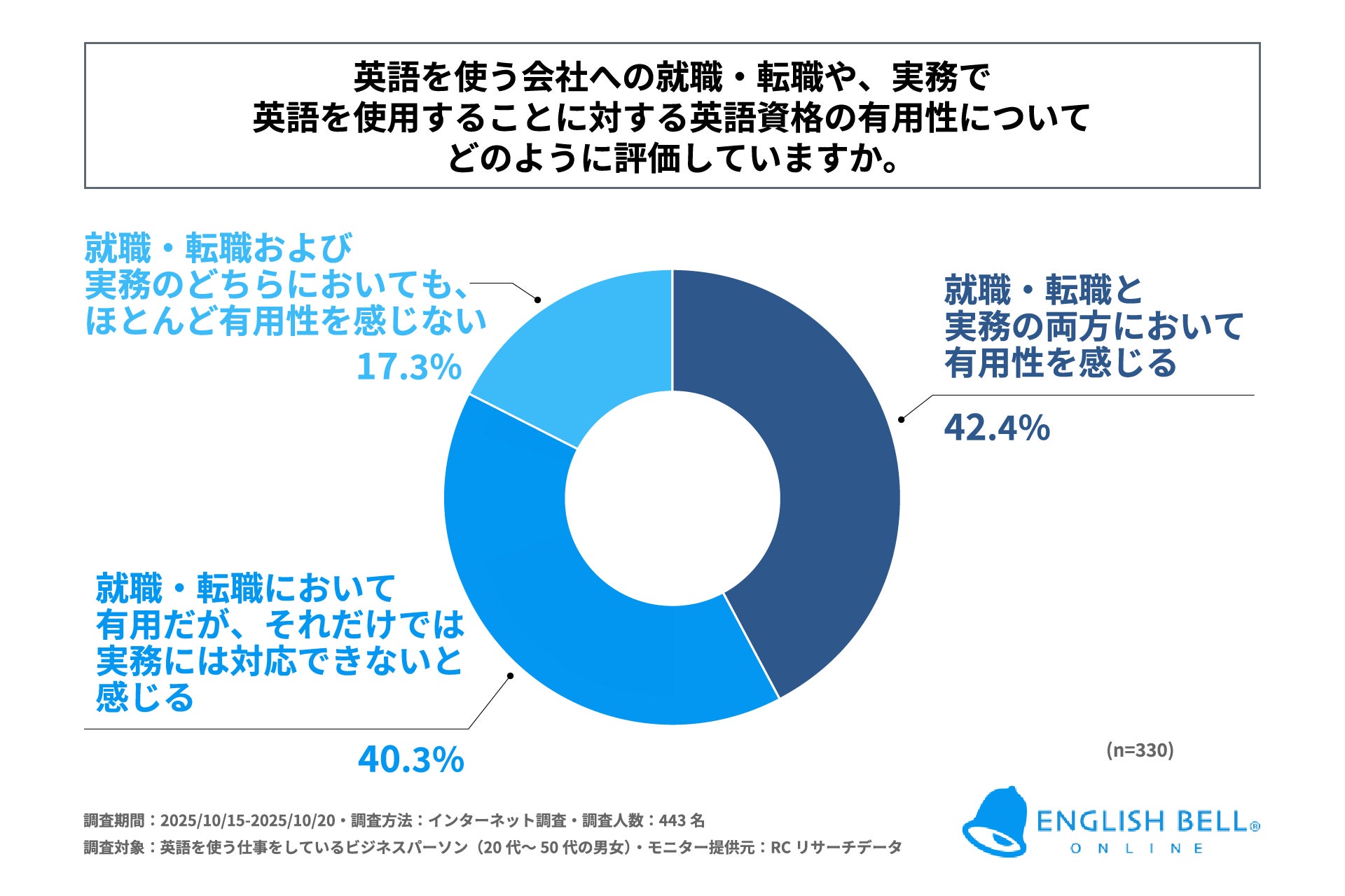 調査の最後、英語資格を持っていると回答した人を対象に「英語を使う会社への就職・転職や、実務で英語を使用することに対する英語資格の有用性についてどのように評価するか」を尋ねる設問への回答では、1位が「就職・転職と実務の両方において有用性を感じる」で42.4%、2位が「就職・転職において有用だが、それだけでは実務には対応できないと感じる」で40.3%、3位が「就職・転職および実務のどちらにおいても、ほとんど有用性を感じない」で17.3%という結果になりました。この結果から、英語資格を持ち英語を使う仕事をしているビジネスパーソンの4割以上が、英語を使う会社への就職・転職や、実務で英語を使用する際に、英語資格は「その両方において有用」と感じていることが明らかになりました。