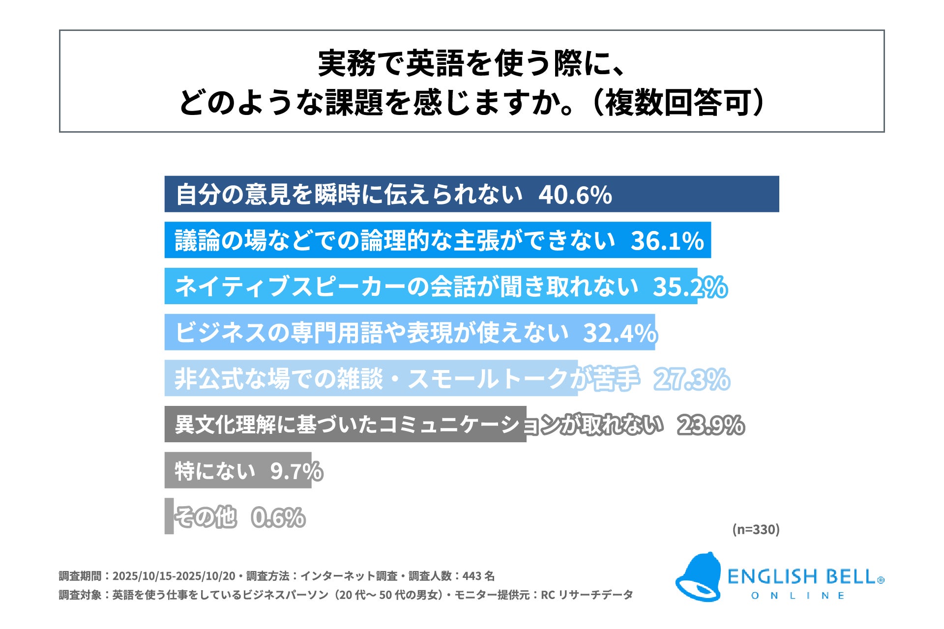 英語資格を持ち英語を使う仕事をしているビジネスパーソンの4割以上が、実務で英語を使う際に課題と感じていることは「自分の意見を瞬時に伝えられないこと」