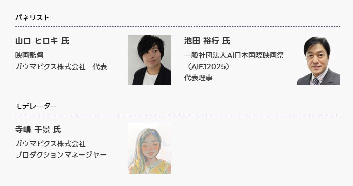 2025年8月には全編生成AIで制作されたオムニバス映画『generAIdoscope:ジェネレイドスコープ』が劇場公開され、その一篇「グランマレビト」を担当した、映画監督山口ヒロキ(ガウマピクス代表)と11月2日/3日に開催された日本初・アジア最大級のAI映画祭「第1回AI 日本国際映画祭 2025」の代表理事を務める池田裕行氏と共に、AIツールを使用した映像制作過程や新しいクリエイティブ時代の到来についてのトークセッションを行います。