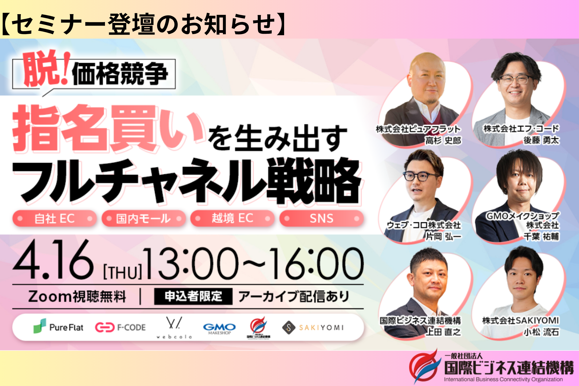 一般社団法人国際ビジネス連結(本社:東京都、以下「当団体」)の理事である上田が、株式会社ピュアフラット(本社:東京都港区、代表取締役:片平健太)主催のオンラインセミナー「脱・価格競争!『指名買い』を生み出すフルチャネル戦略 ~自社EC×国内モール×越境EC×SNS〜」に登壇することをお知らせいたします。