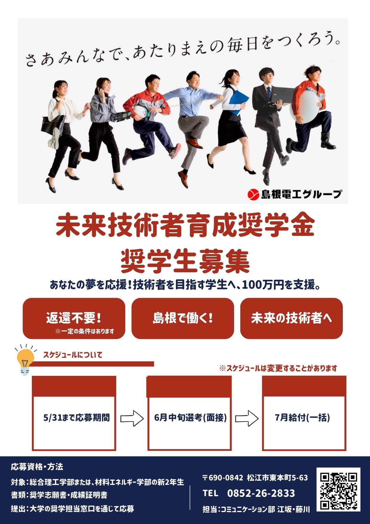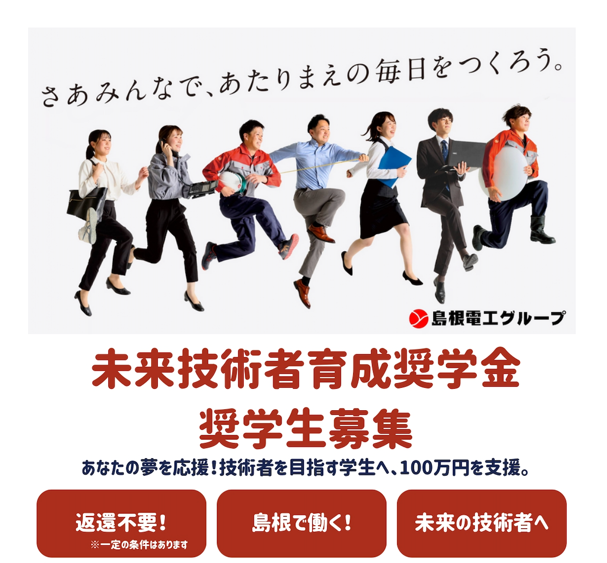 『あたりまえの毎日をつくる』をスローガンに掲げる島根電工グループ〔代表:島根電工株式会社(本社:島根県松江市、代表取締役社長:野津 廣一)、以下、島根電工グループ〕は、このたび学術研究の奨励と地域の担い手となる有望な人財育成を目的として 、島根大学の学生を対象とした無利子、返還不要※の「未来技術者育成奨学金」を設立いたしました。